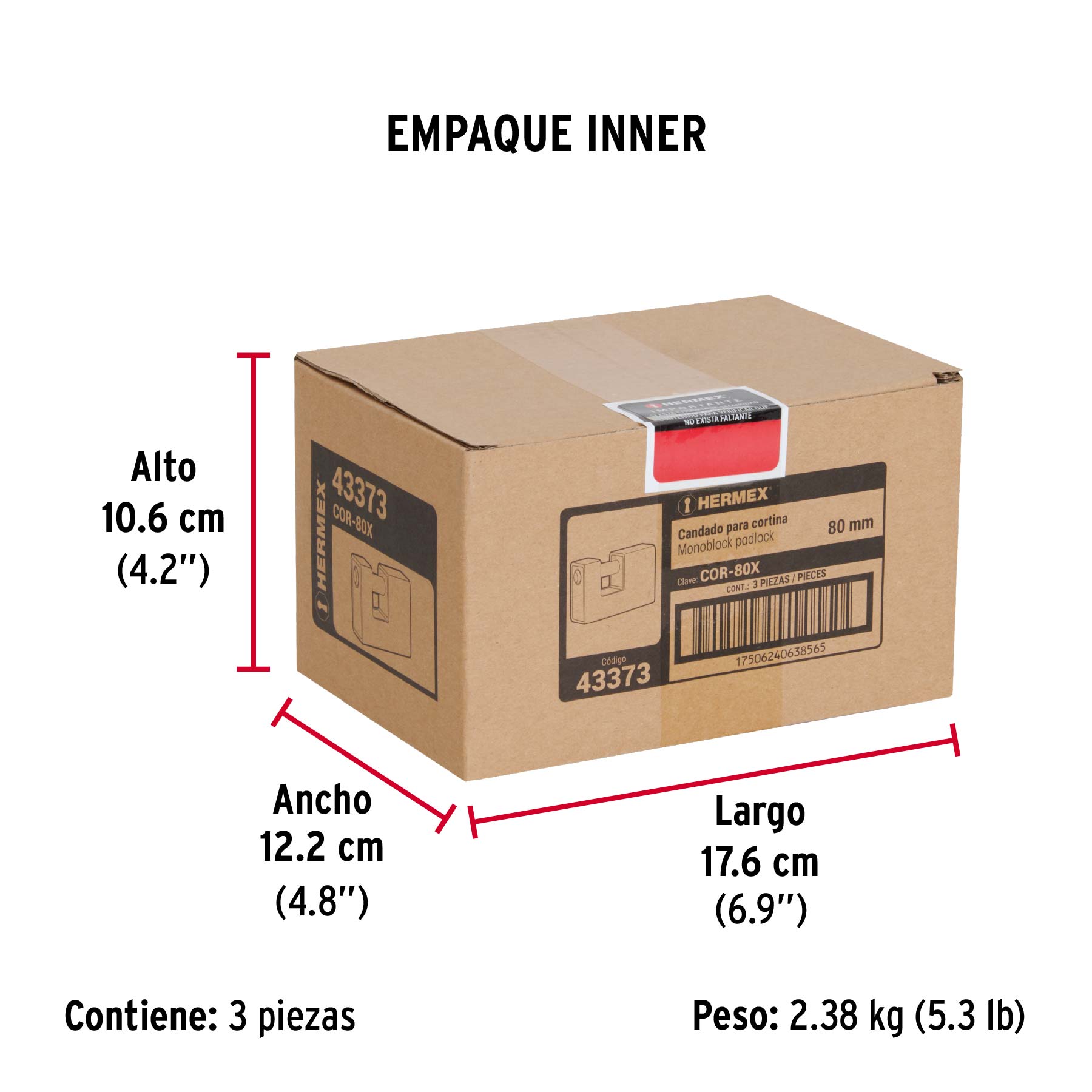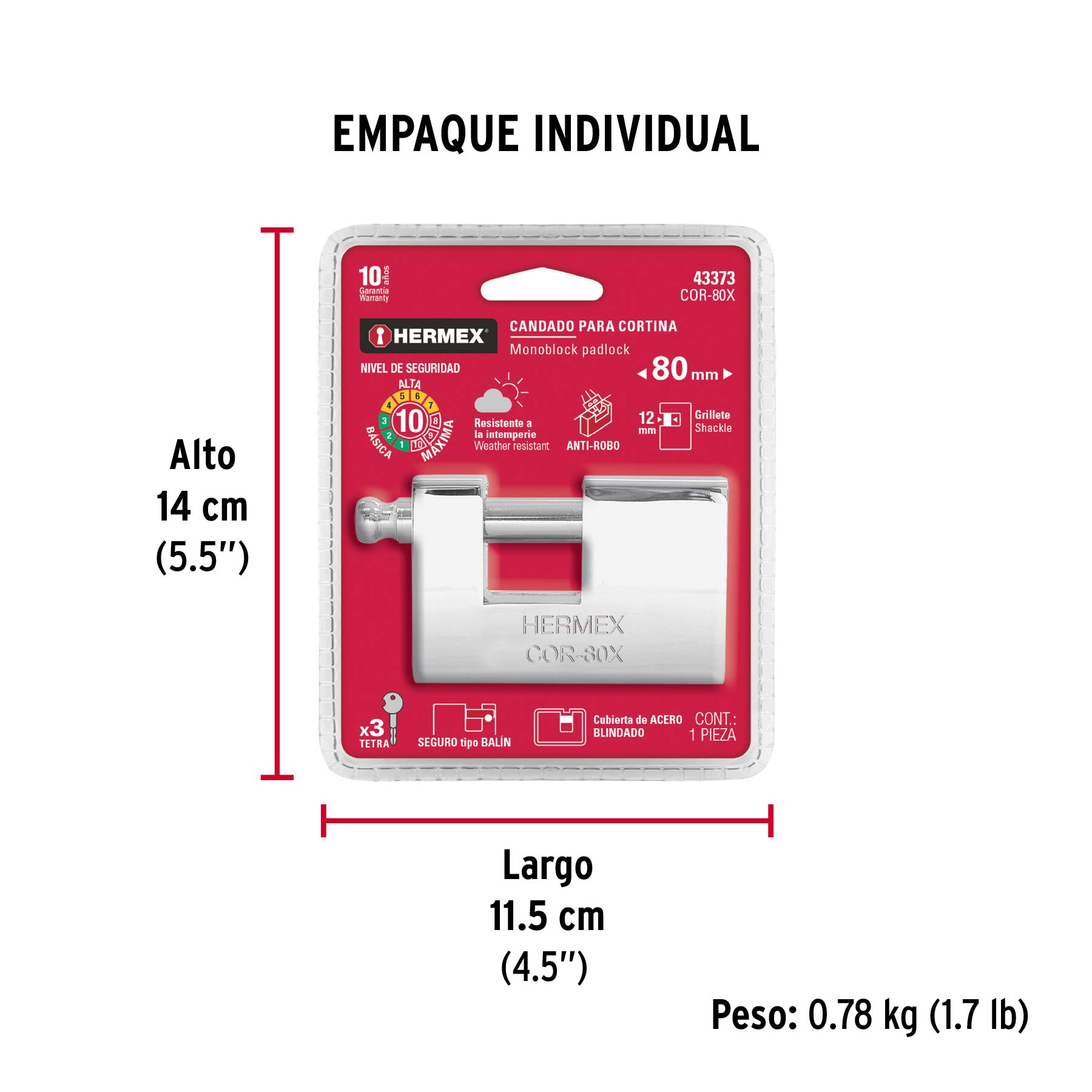 Candado antipalanca, 80mm, blindado, llave tetra, HERMEX