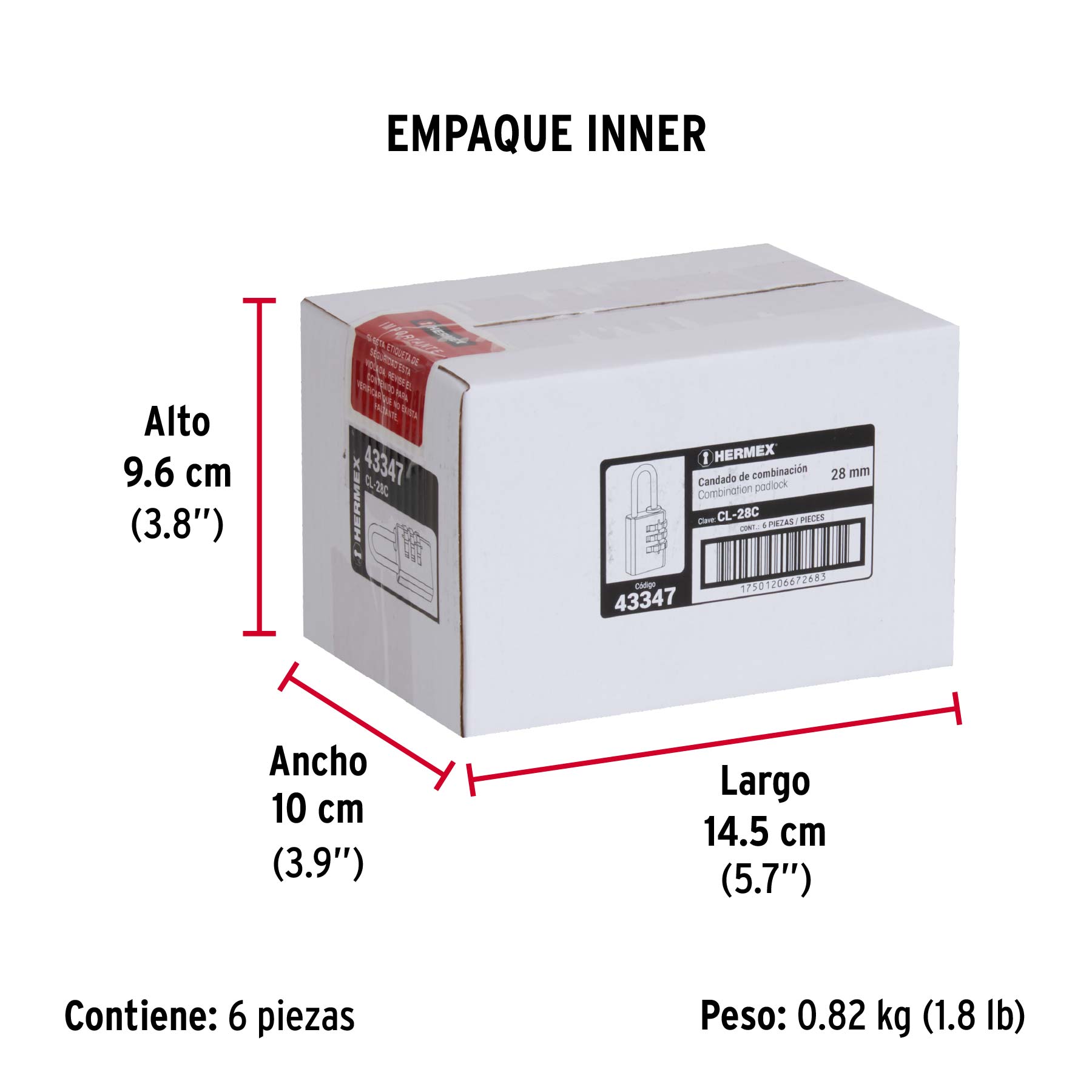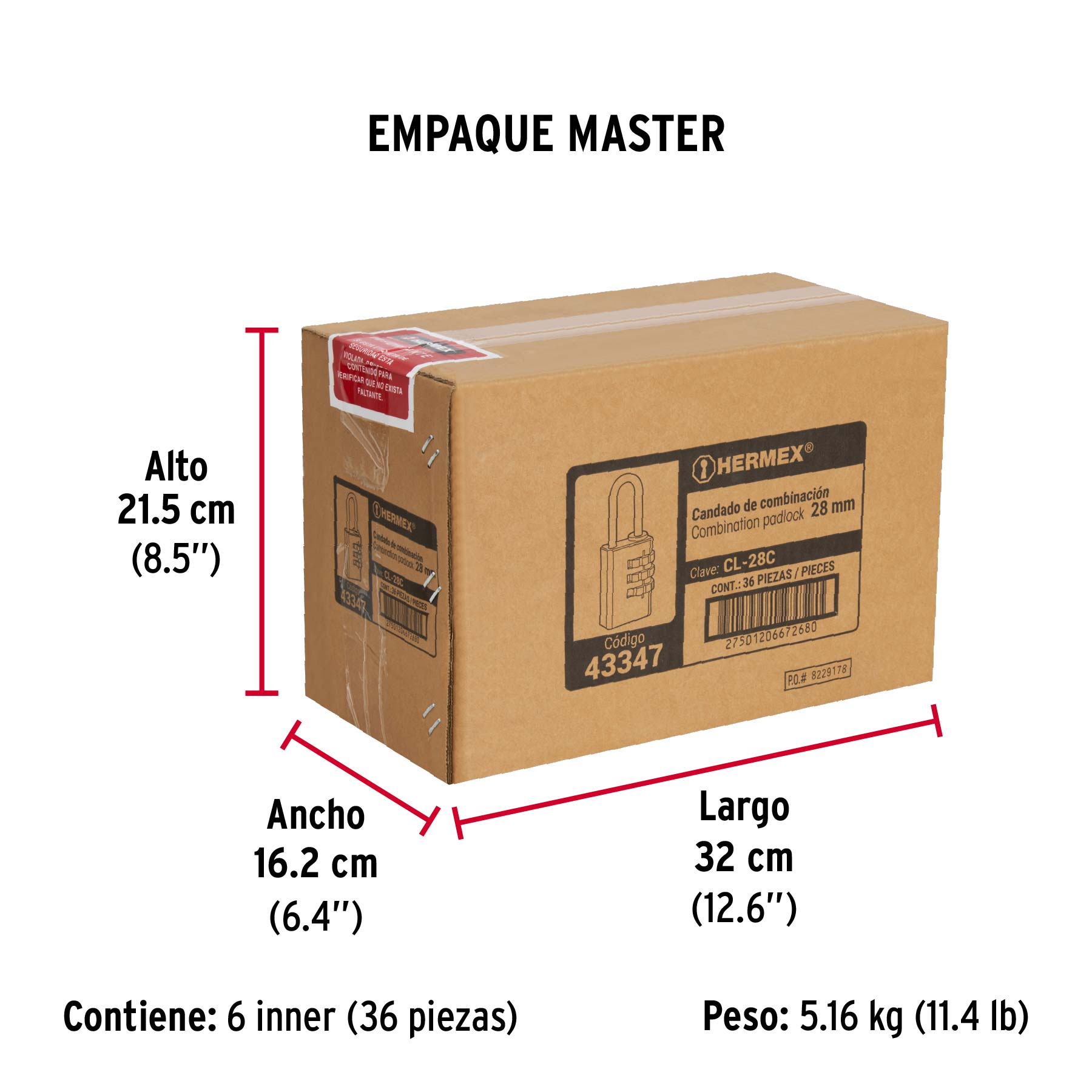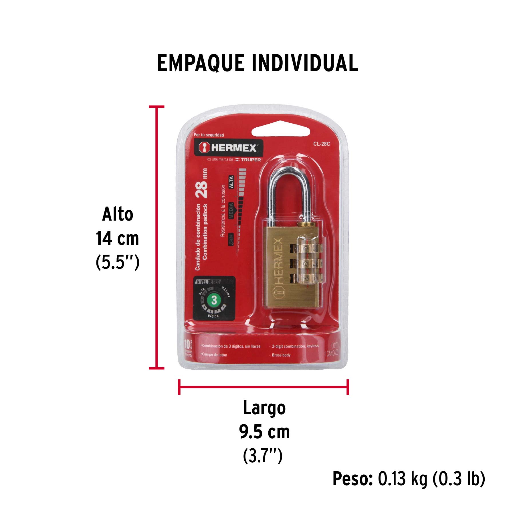 Candado de combinación 28 mm cuerpo de latón en blíster