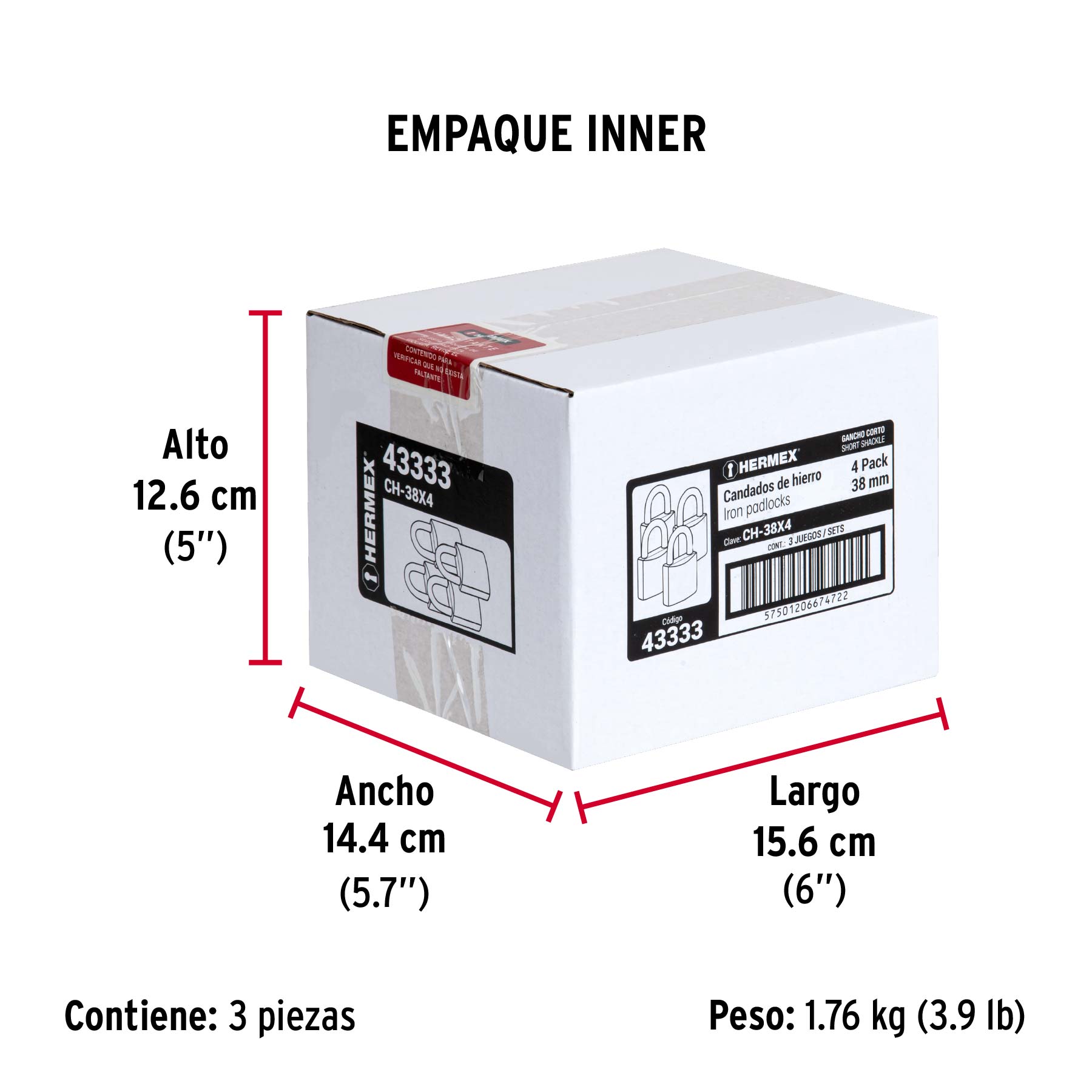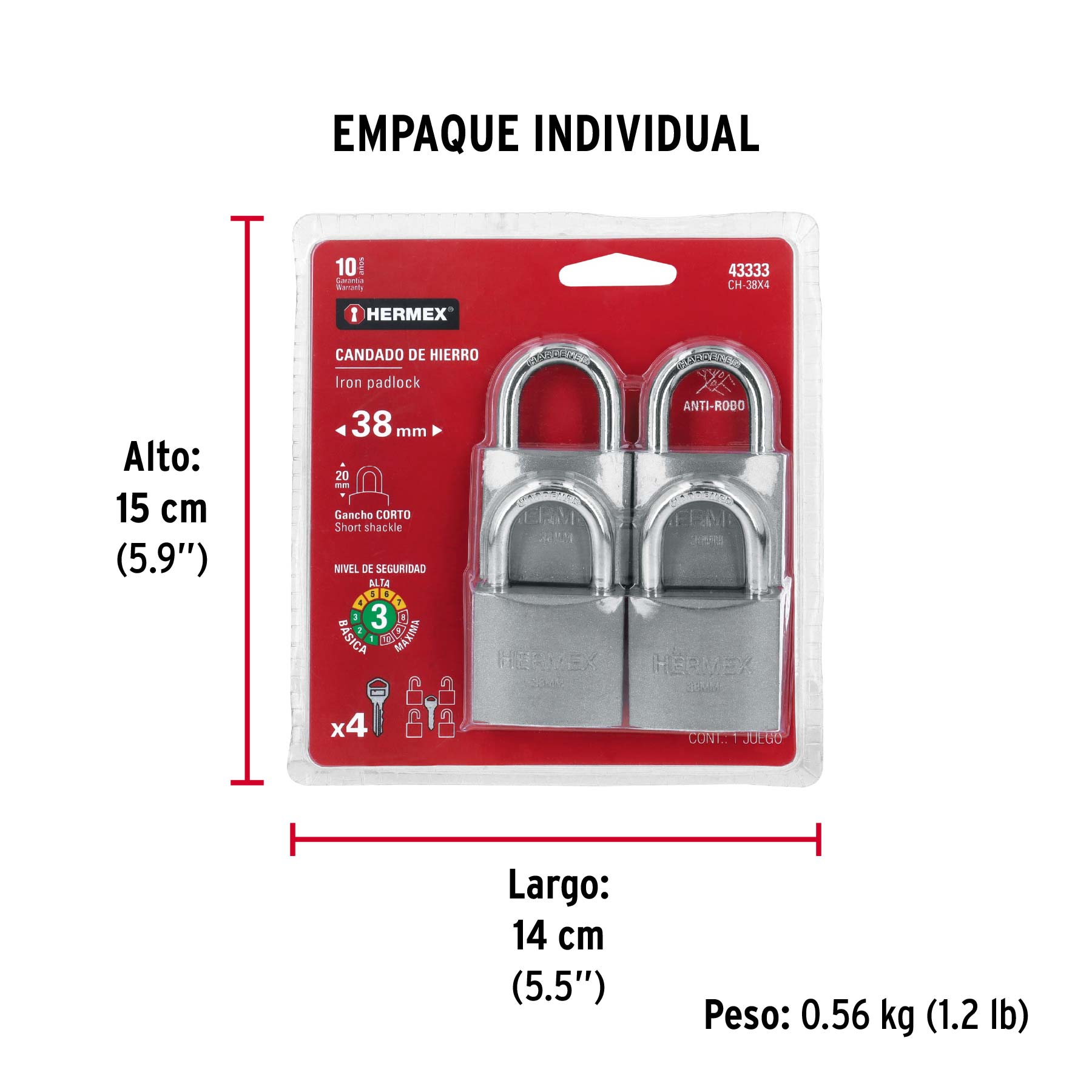 Blíster con 4 candados de hierro de 38 mm, gancho corto