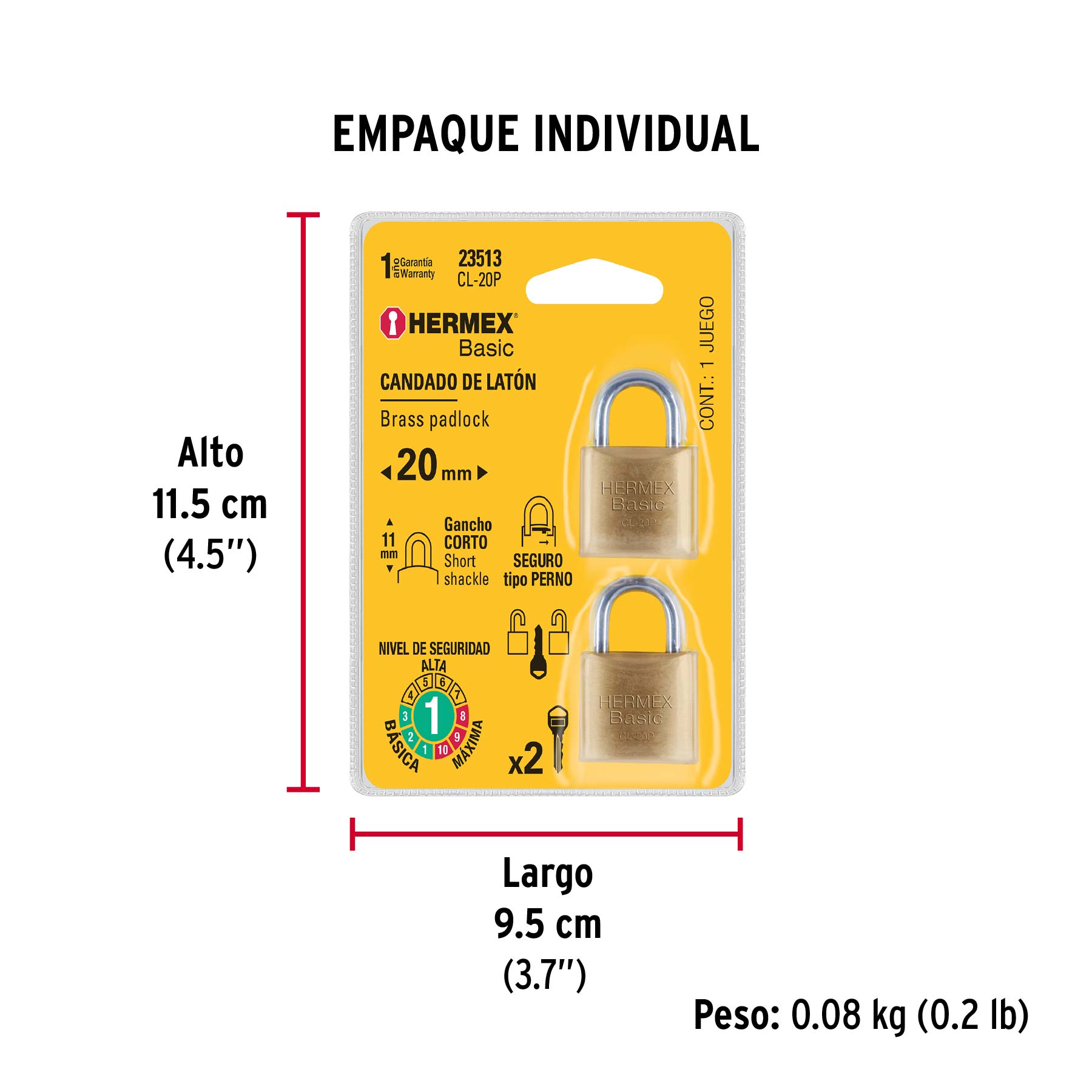 Blíster con 2 candados de latón de 20mm, HERMEX BASIC