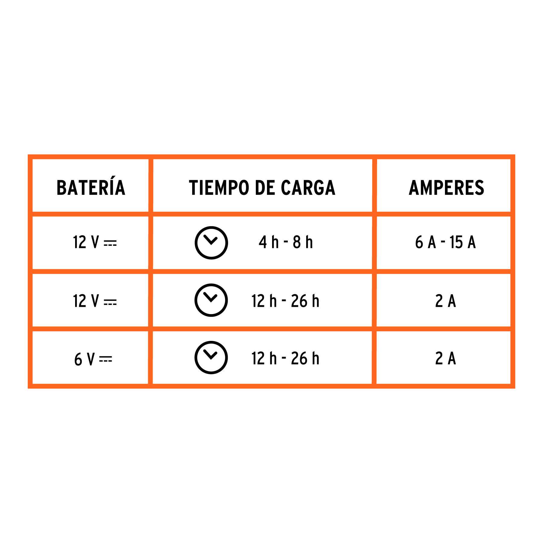 Velocidad de carga continua | 15 A carga rápida | 6 A carga lenta | 2 A mantenimiento |