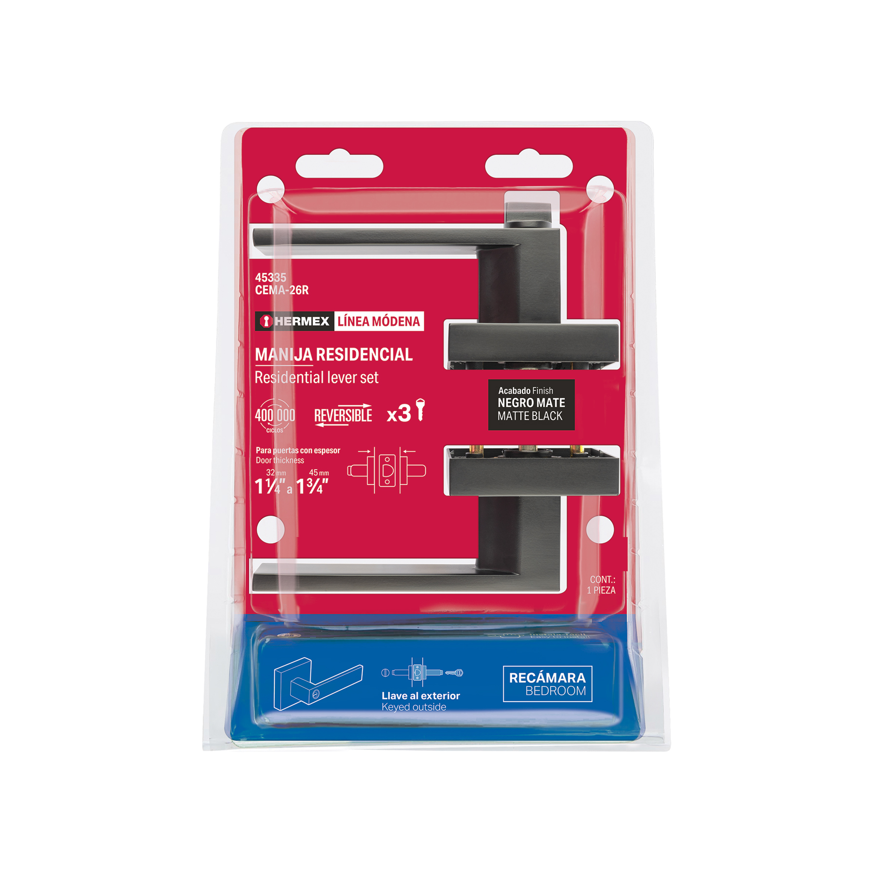 Cerradura manija "Módena" p/recámara, negro mate, HERMEX