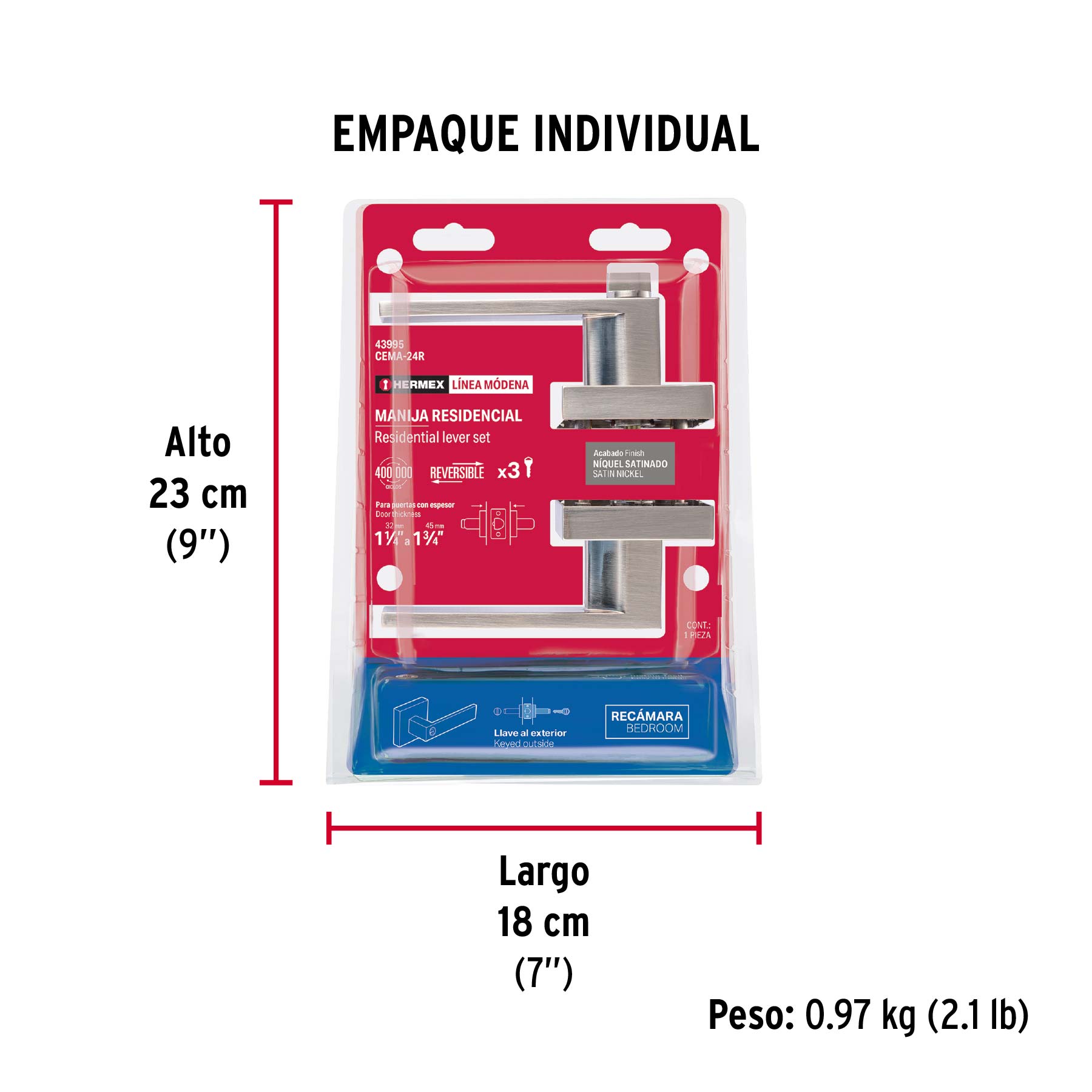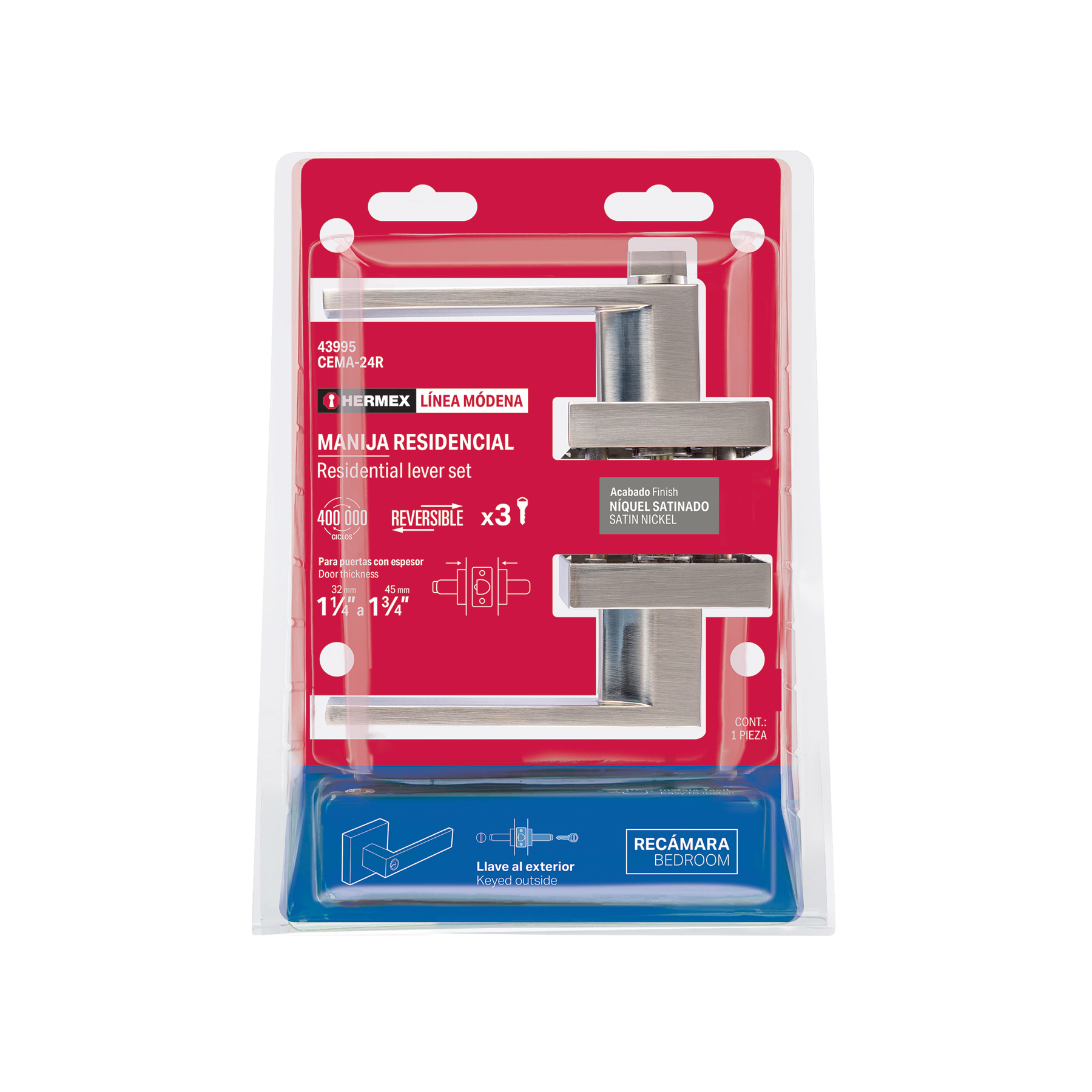Cerradura manija "Módena" p/recámara, níquel satinado,HERMEX