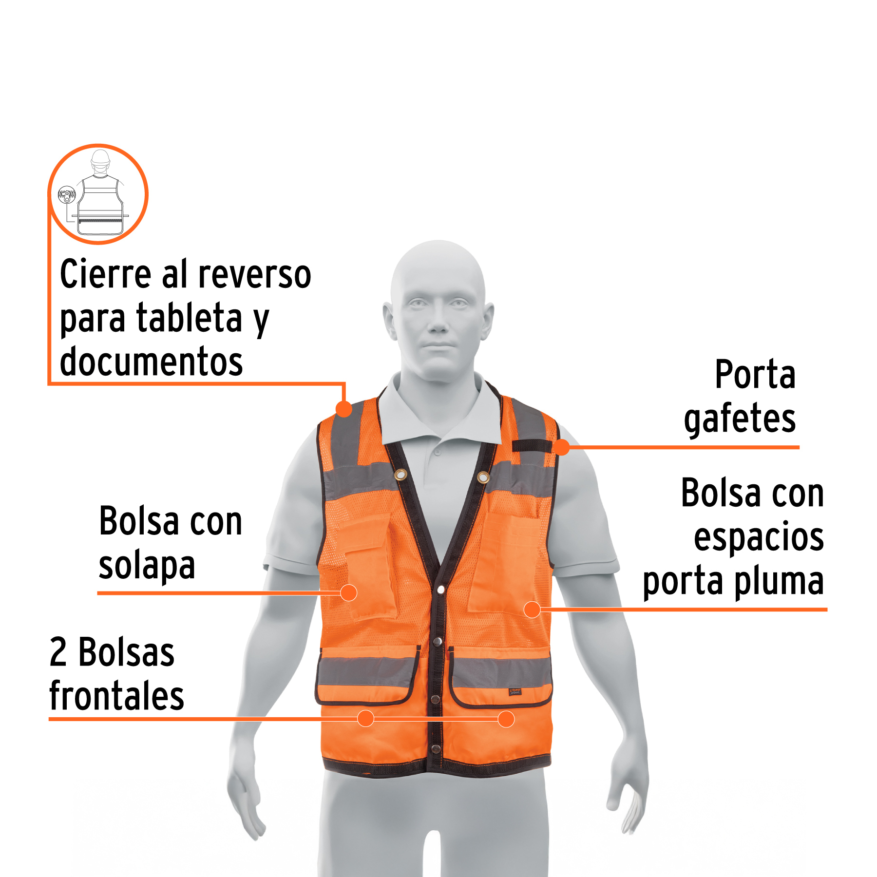 8 bolsas (2 frontales, 1 porta celular, 1 porta plumas, 1 porta gafetes, 2 interiores y cierre al reverso para tableta y documentos)