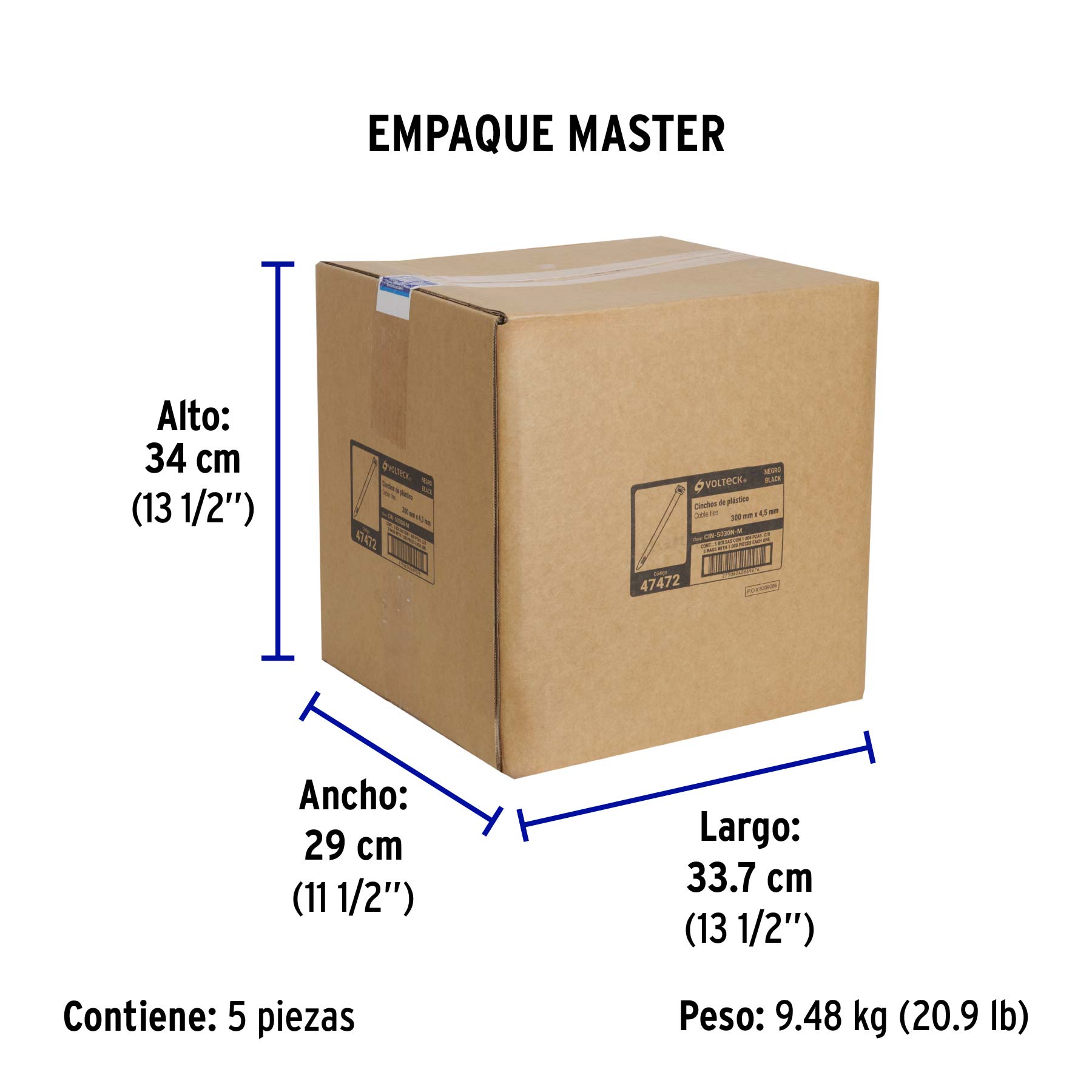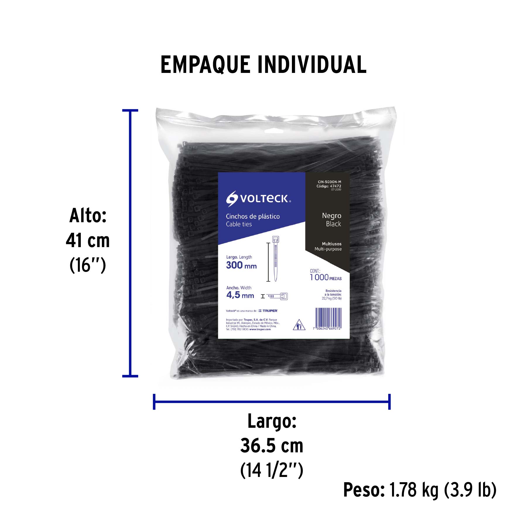Bolsa con 1000 cinchos plásticos 50 lb, 300 x 4.5 mm, negro