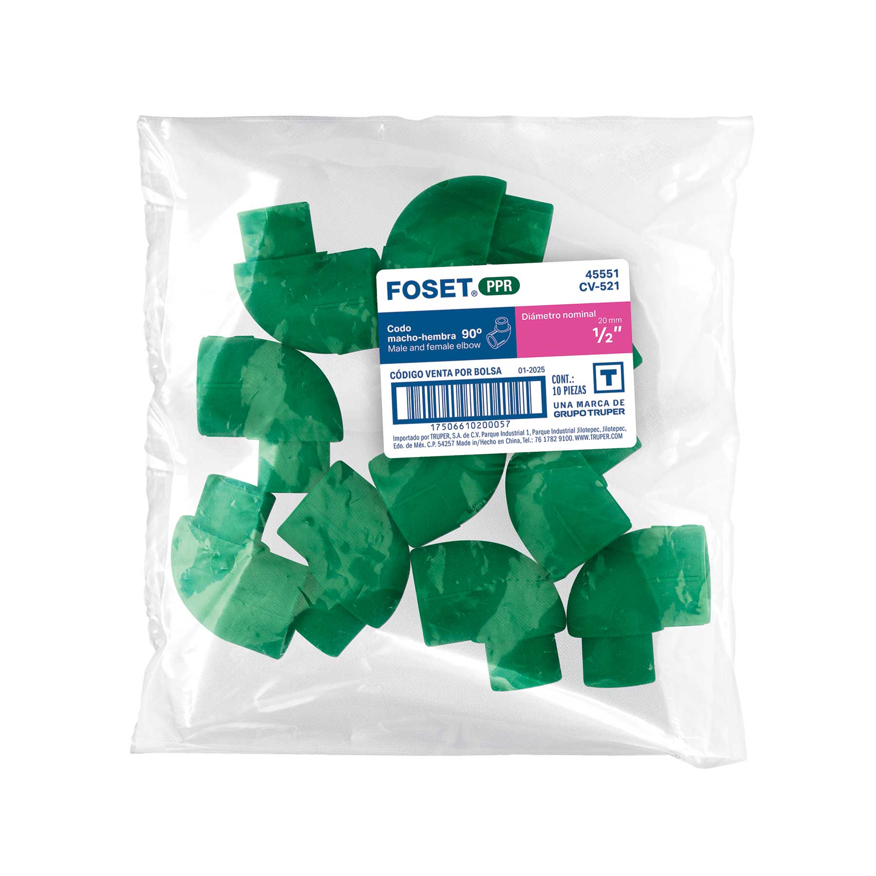 Codo 90° PPR, 1/2", macho-hembra, FOSET
