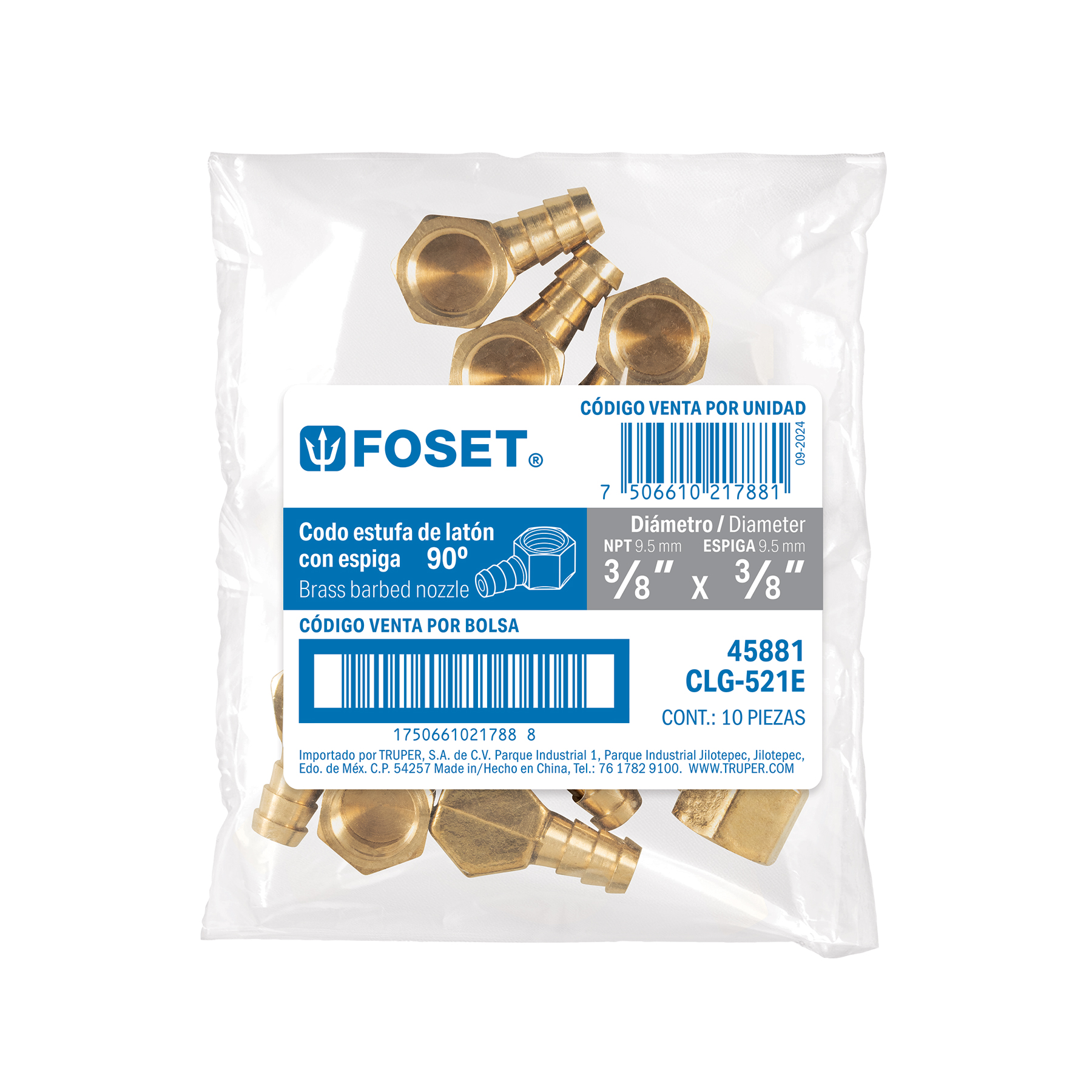 Codo estufa a 90° de latón con espiga de 3/8", FOSET