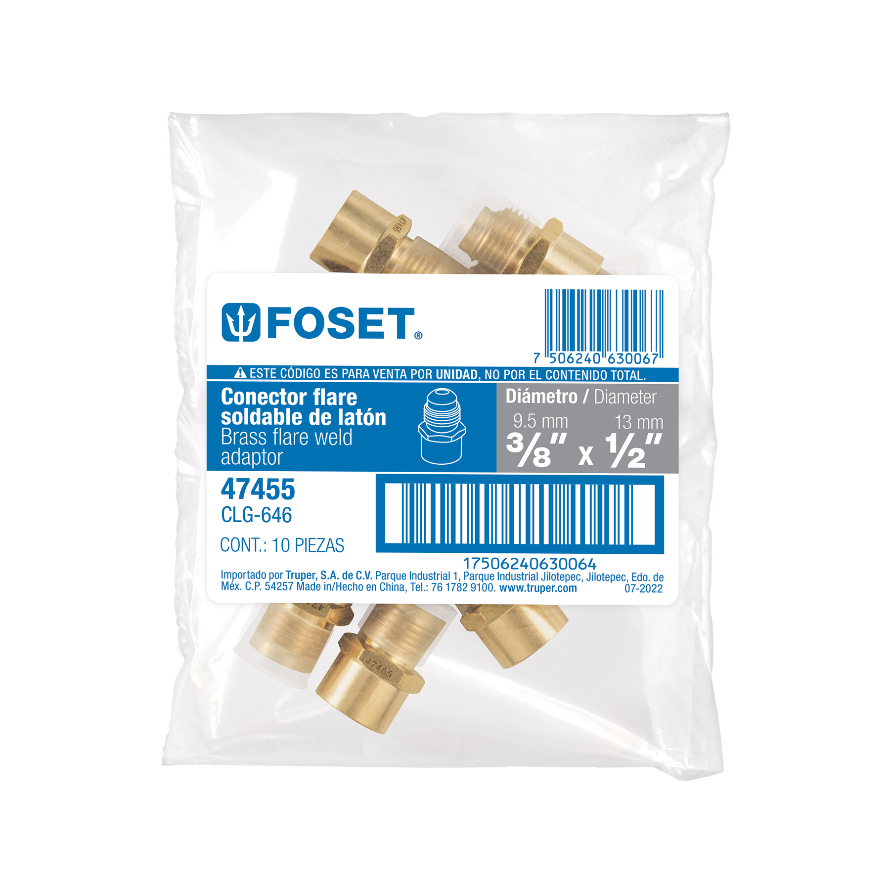 Conector flare soldable de latón, 3/8" x 1/2", FOSET