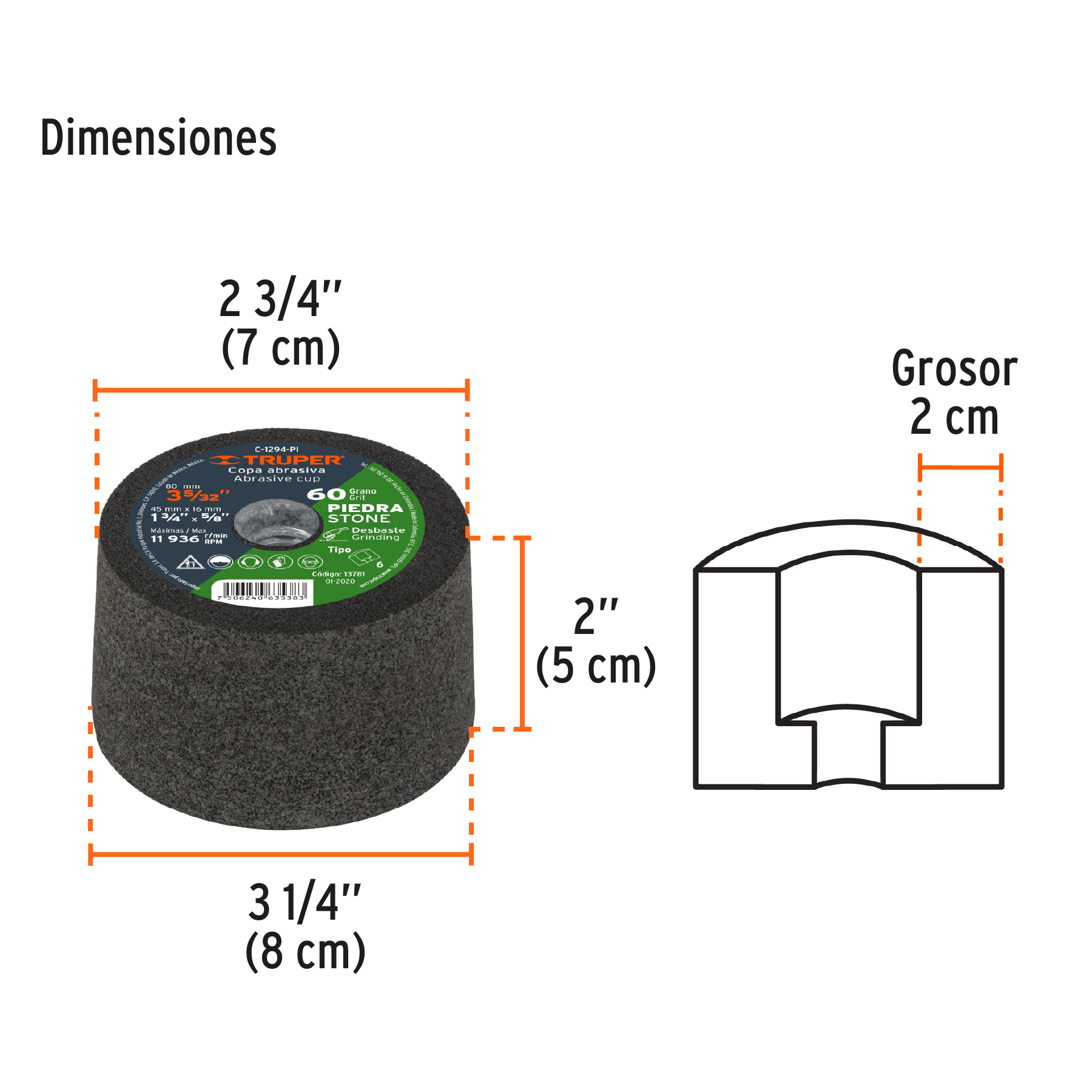 Copa desbaste de piedra 3-5/32" grano 60, eje 5/8-11, TRUPER