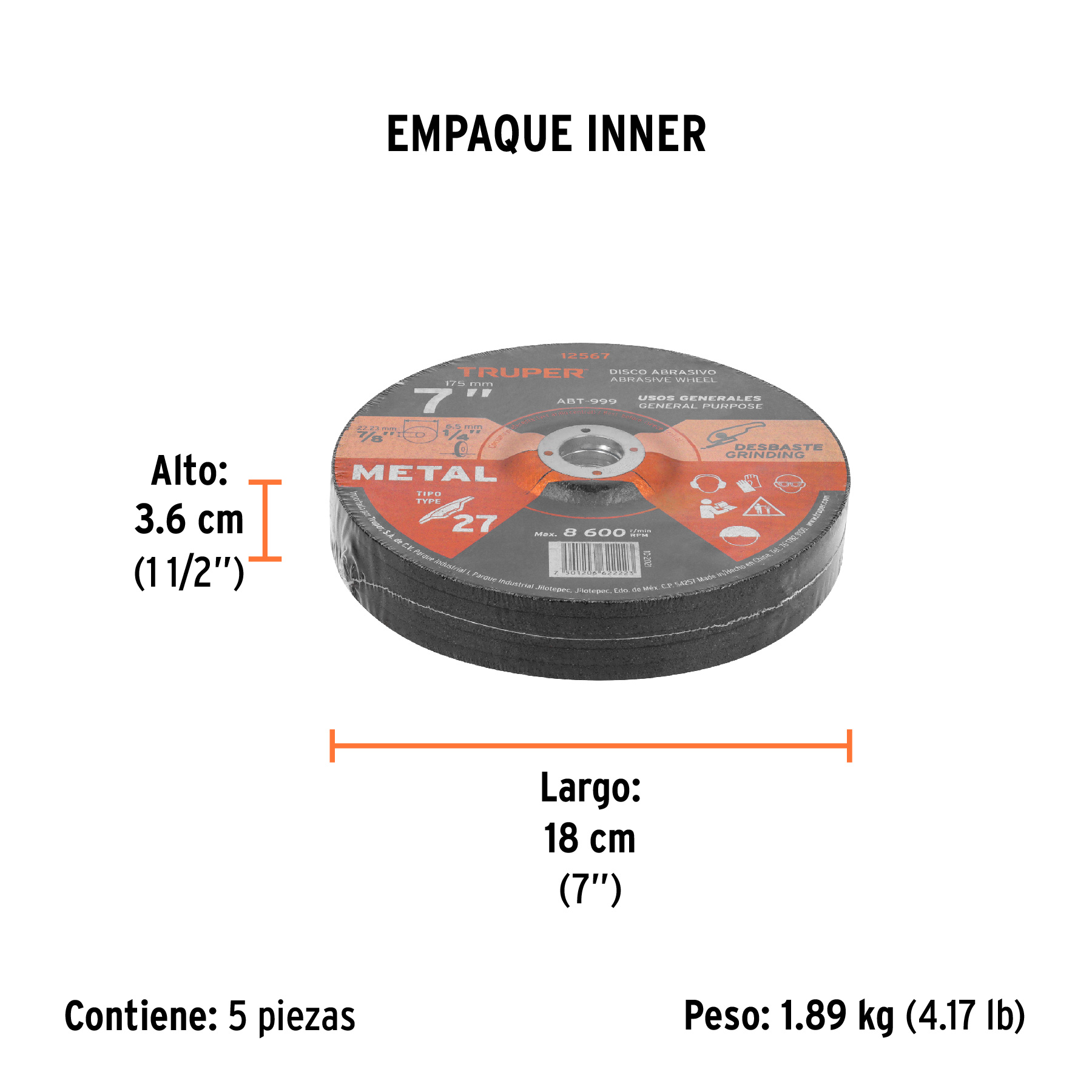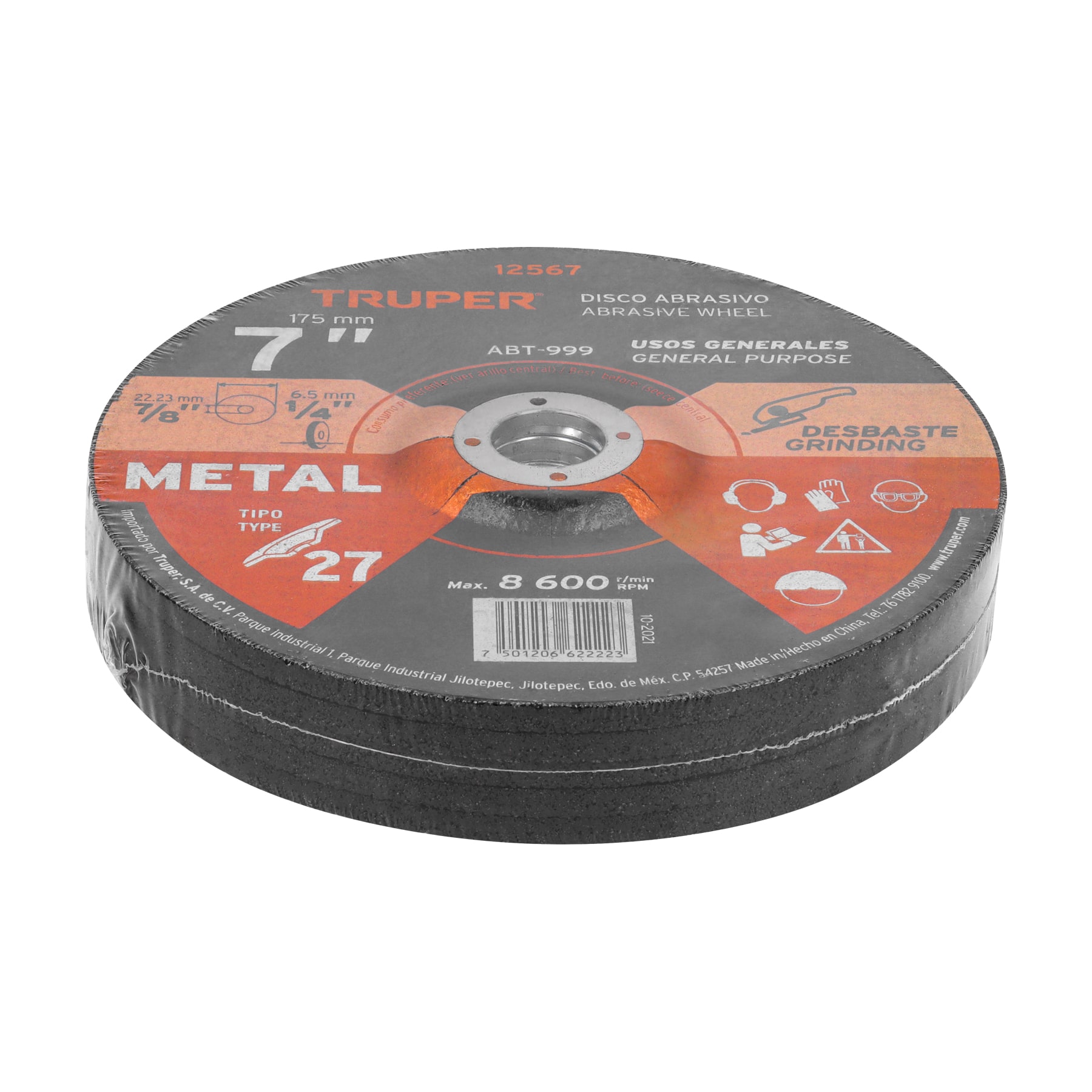 Disco Tipo 27 de 7" x 6.4 mm para desbaste de metal, TRUPER