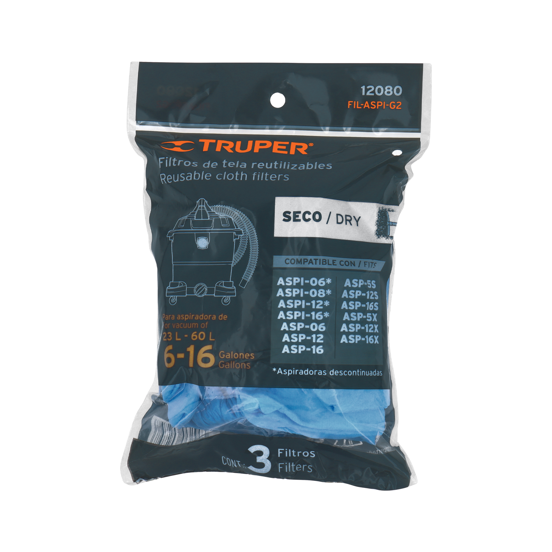 Bolsa con 3 filtros de tela, aspiradoras 5-16 gal, TRUPER