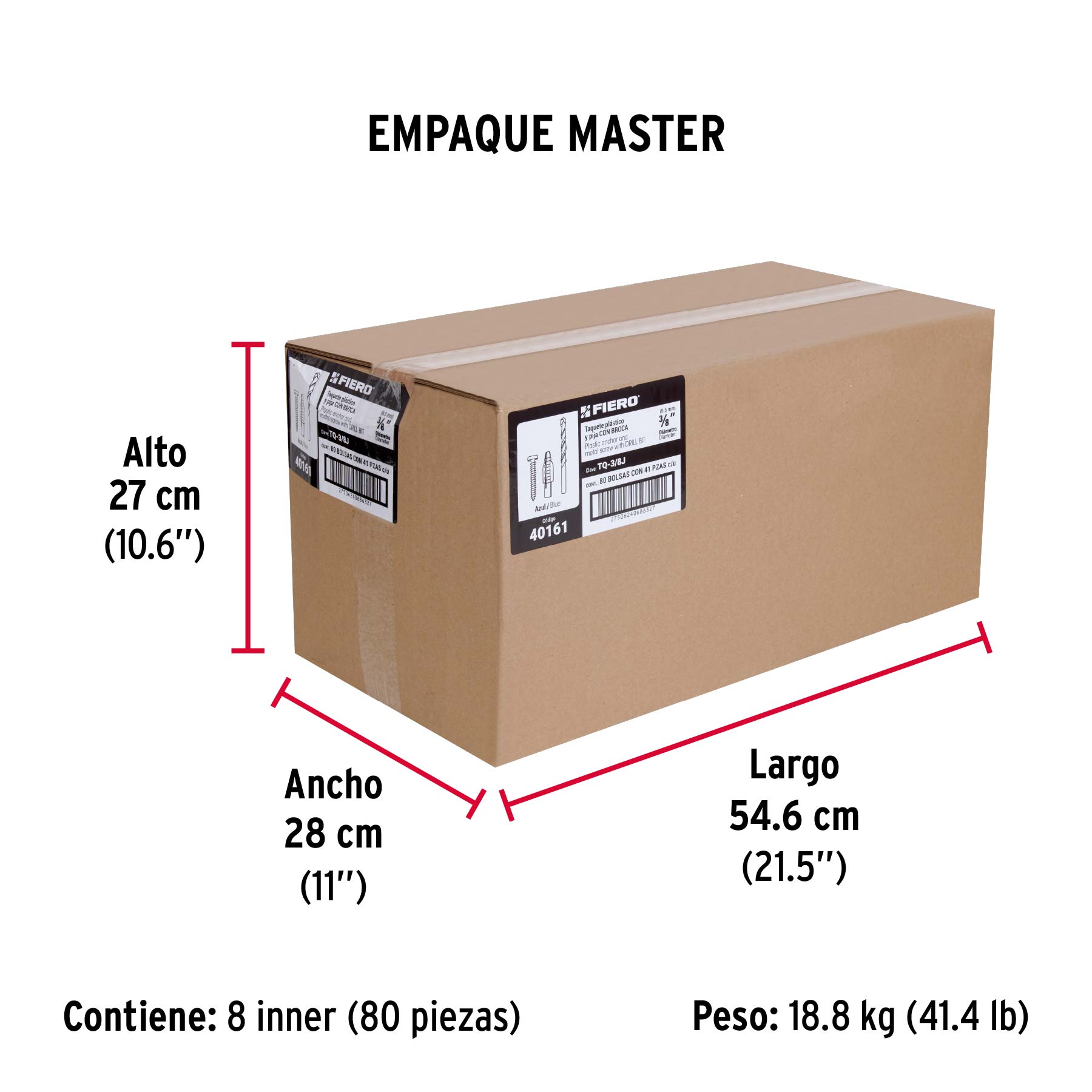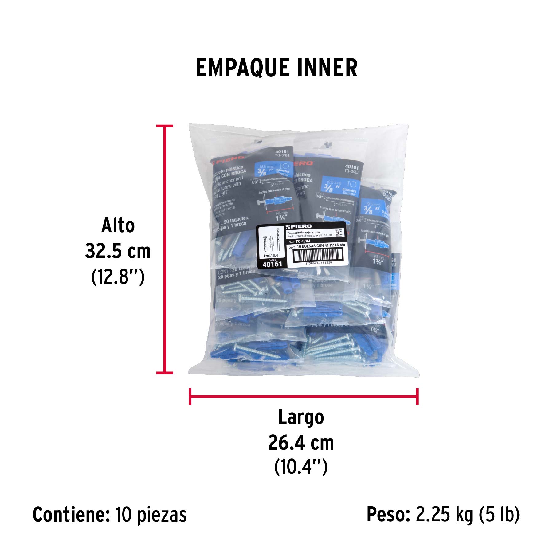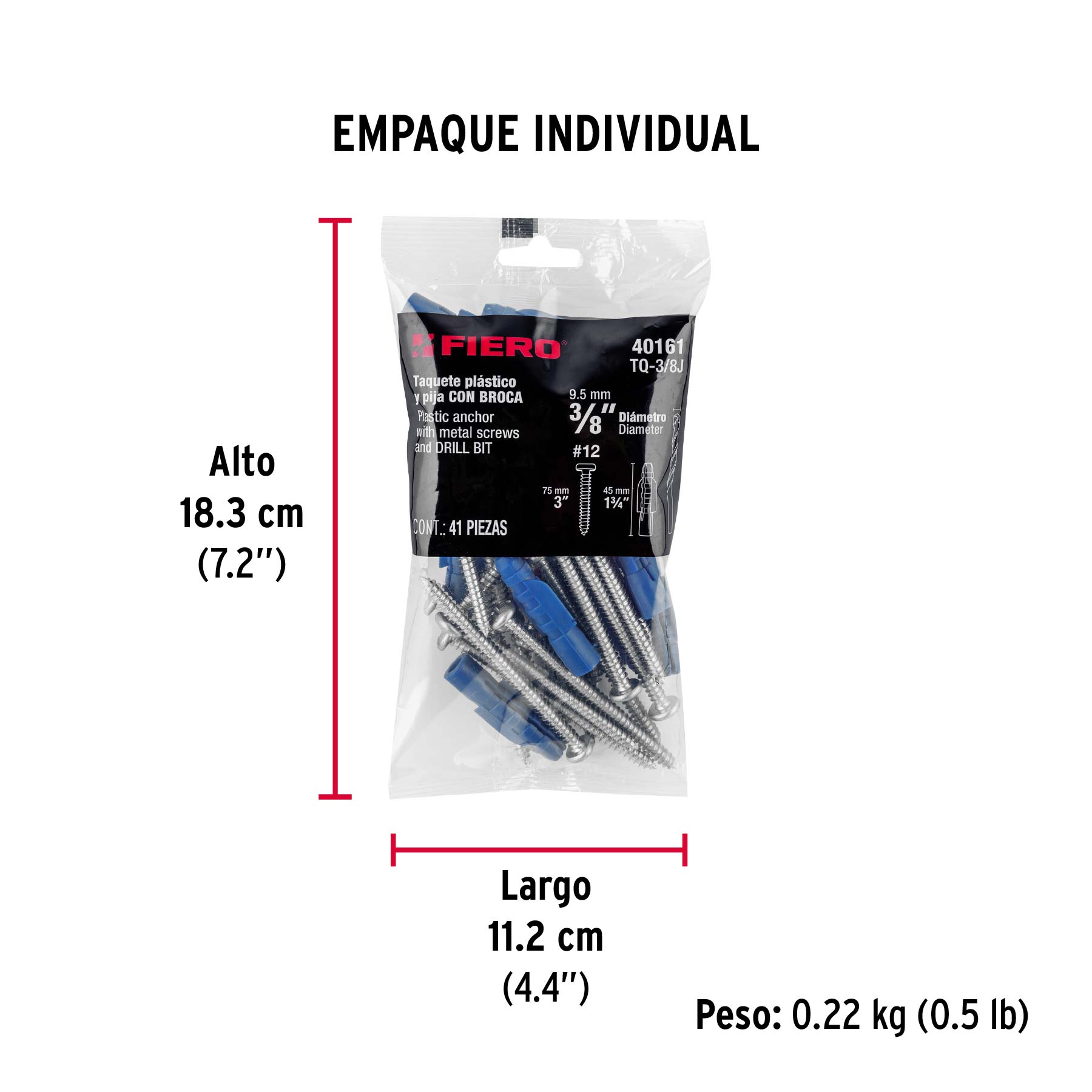 Kit de 20 taquetes 3/8" con pijas #12 y 1 broca 3/8", FIERO