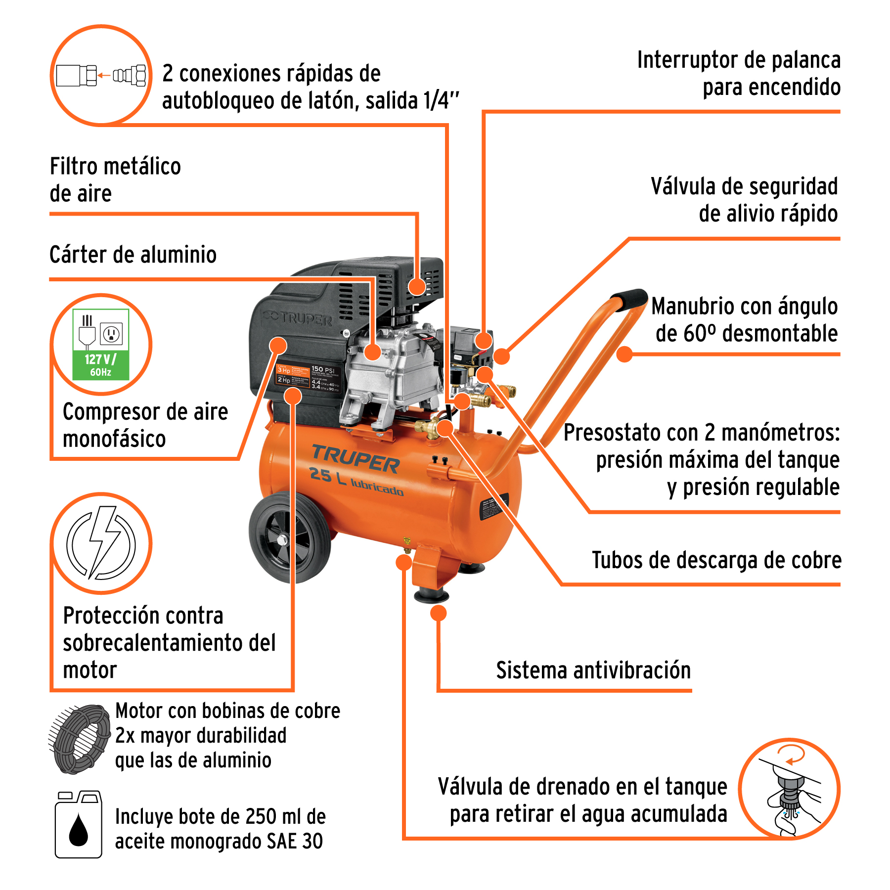 Compresor horizontal 25 L, 3 HP (potencia máxima), 127 V