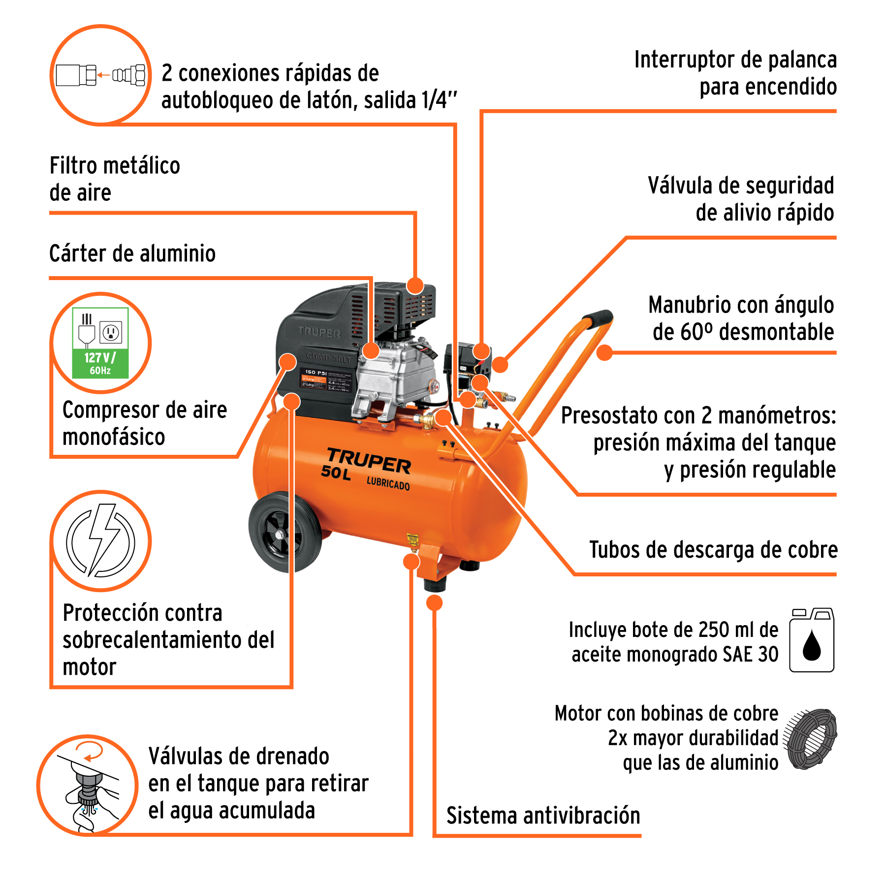 Compresor horizontal 50 L, 3 1/2 HP (potencia máxima), 127 V