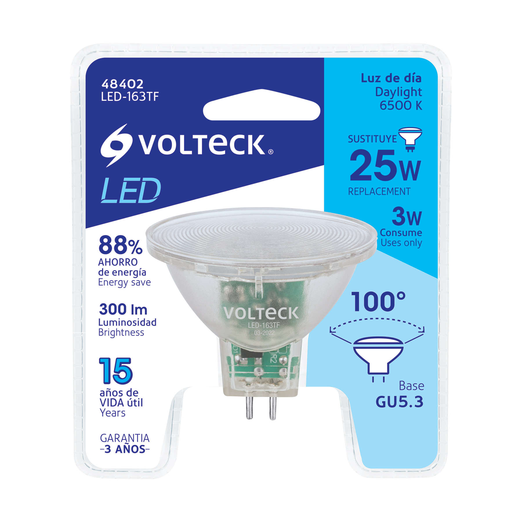 Lámpara trans. de LED 3W MR16 base GU5.3 luz de día, blíster
