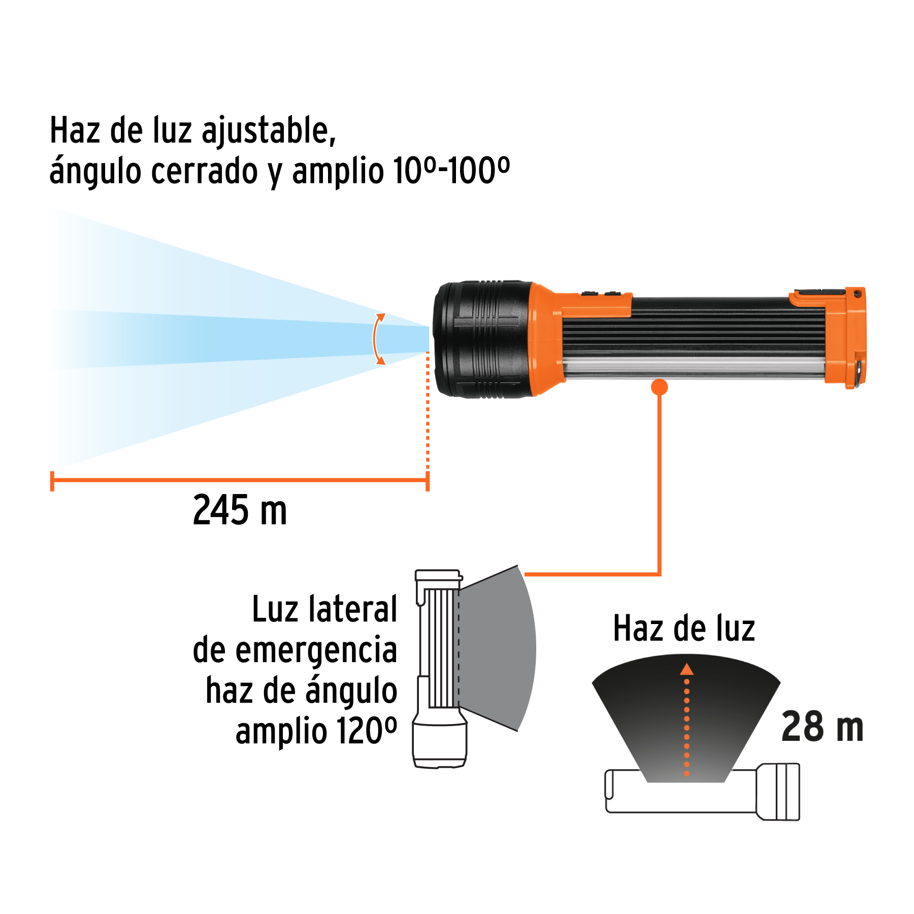 LED de alta luminosidad (frontal), LED COB y luz roja (lateral)