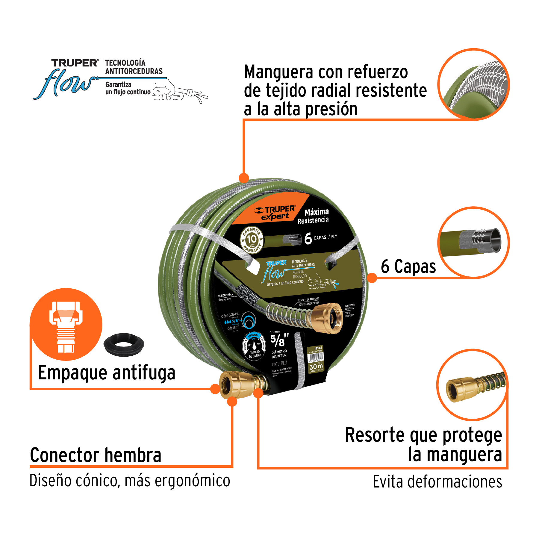 Manguera 5/8" anti-torceduras 6 capas 30m conexiones d/metal
