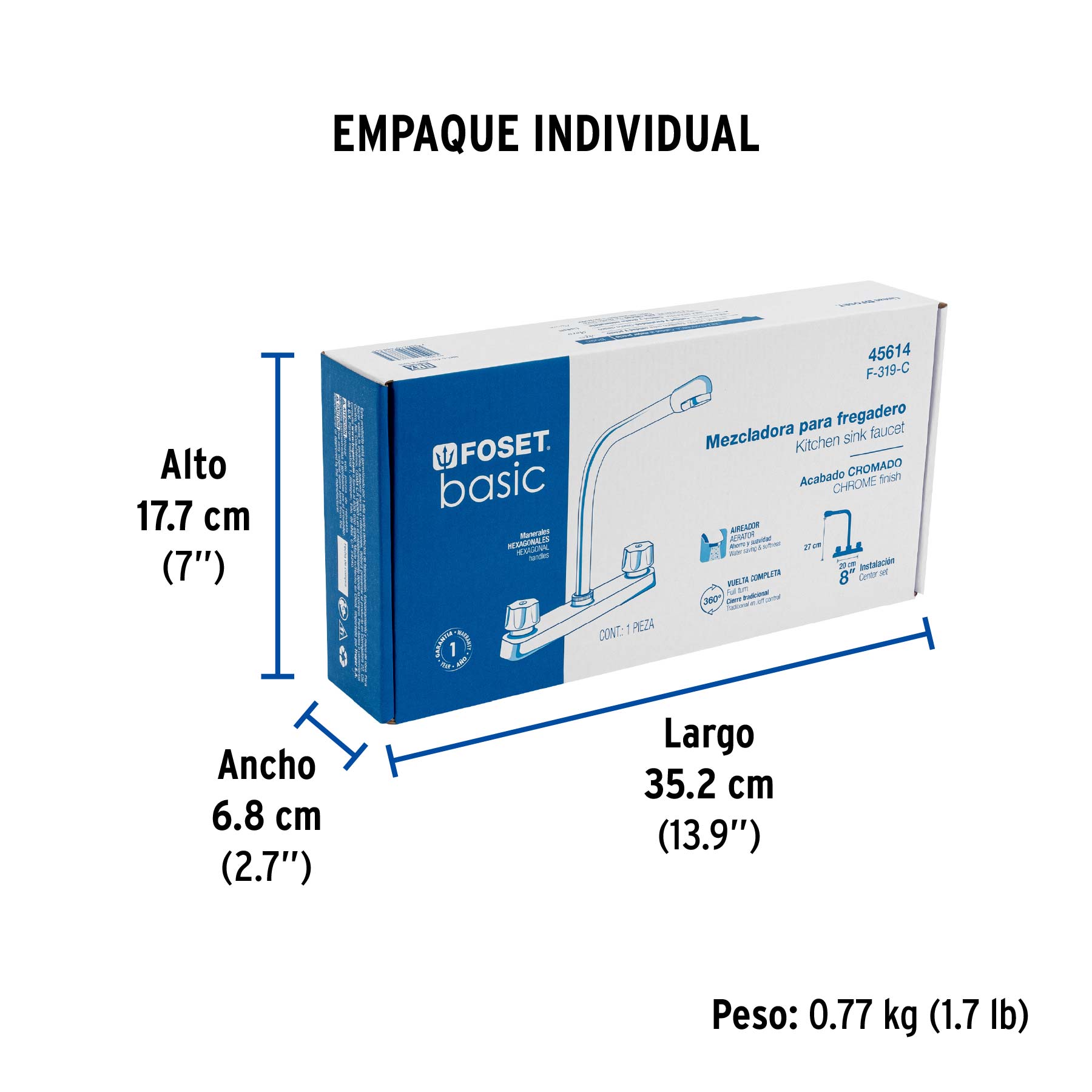 Mezcladora 8" fregadero cromo, cuello cobra,compresión,BASIC