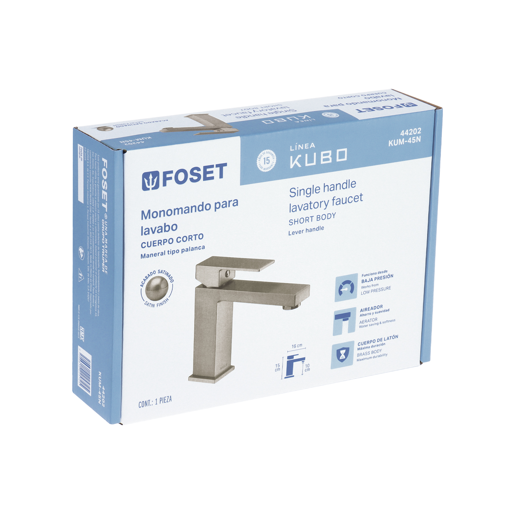 Monomando corto para lavabo, satín, FOSET KUBO