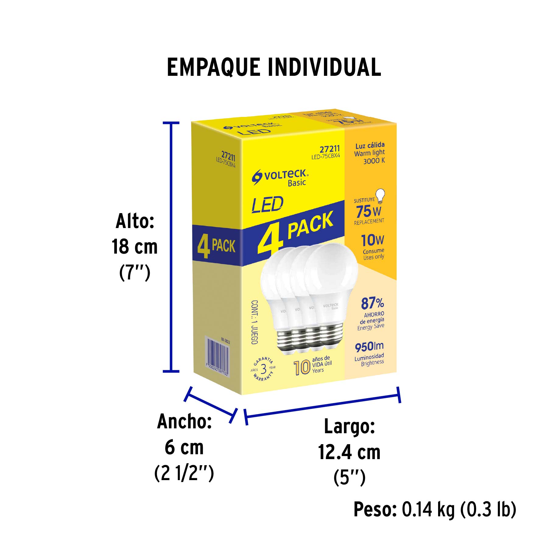 Pack 4 focos LED 10W (75W) A19, 3000K cálida, 950 lm, BASIC