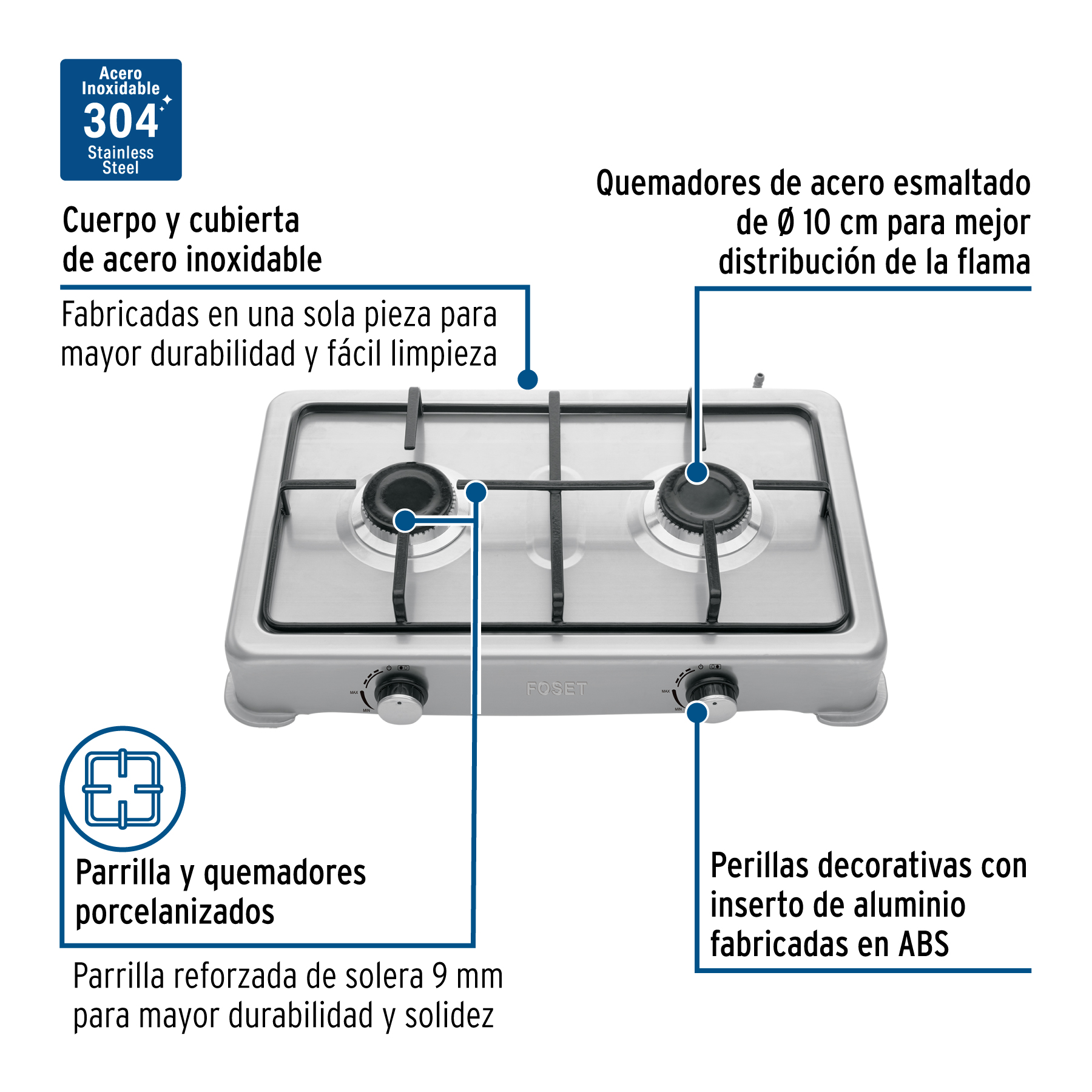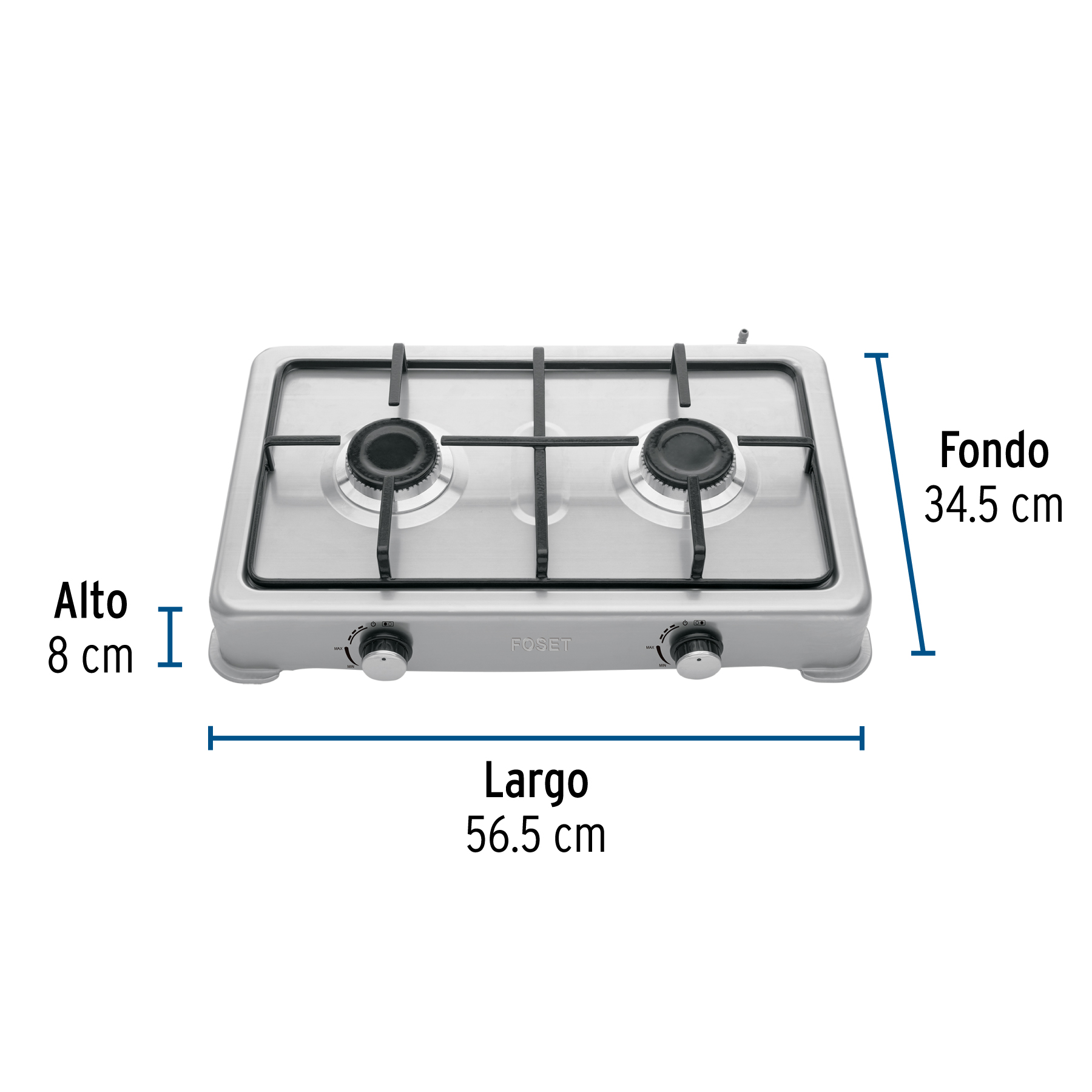 Parrilla de gas de sobreponer,2 quemadores, inox, FOSET AERO