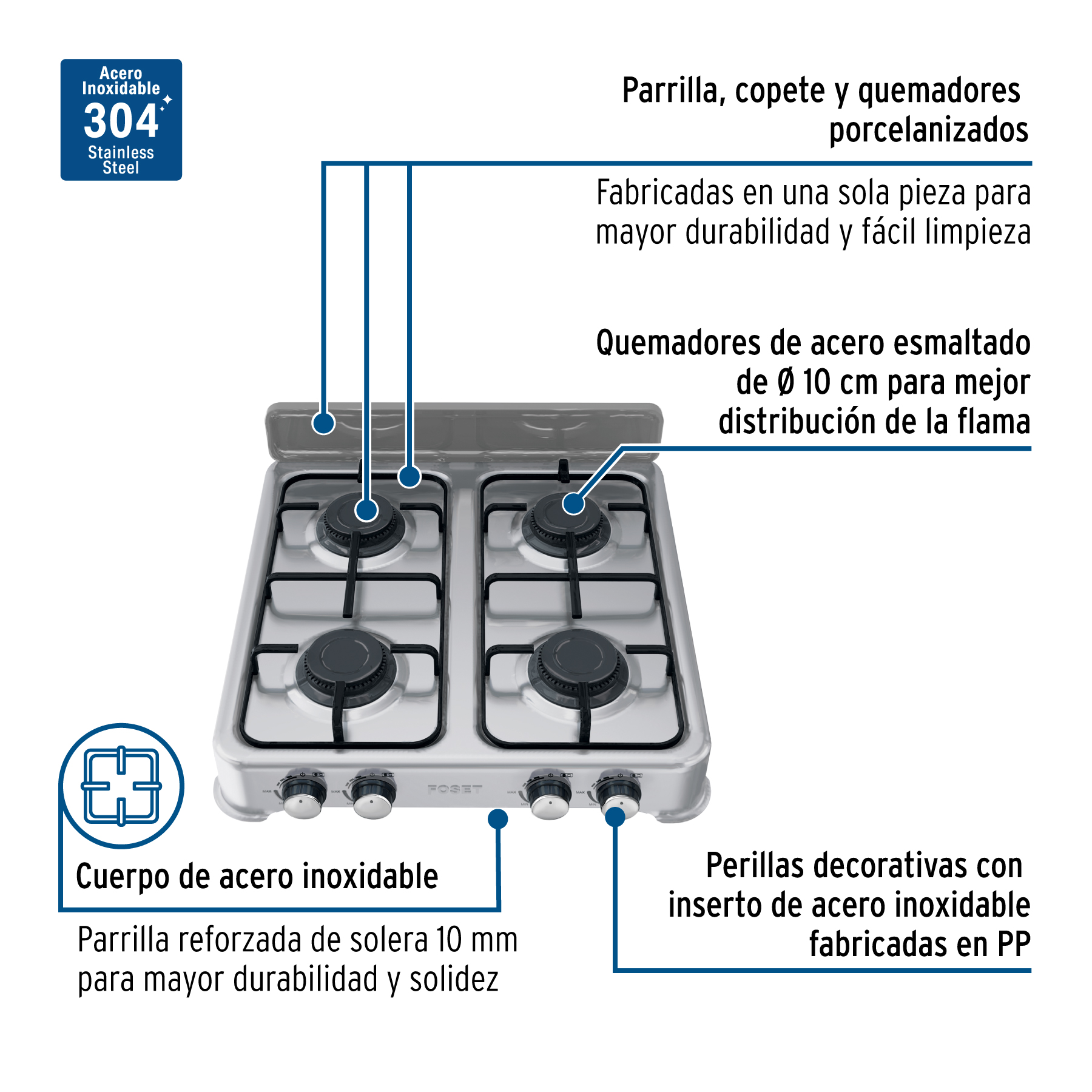 Parrilla de gas de sobreponer,4 quemadores, inox, FOSET AERO
