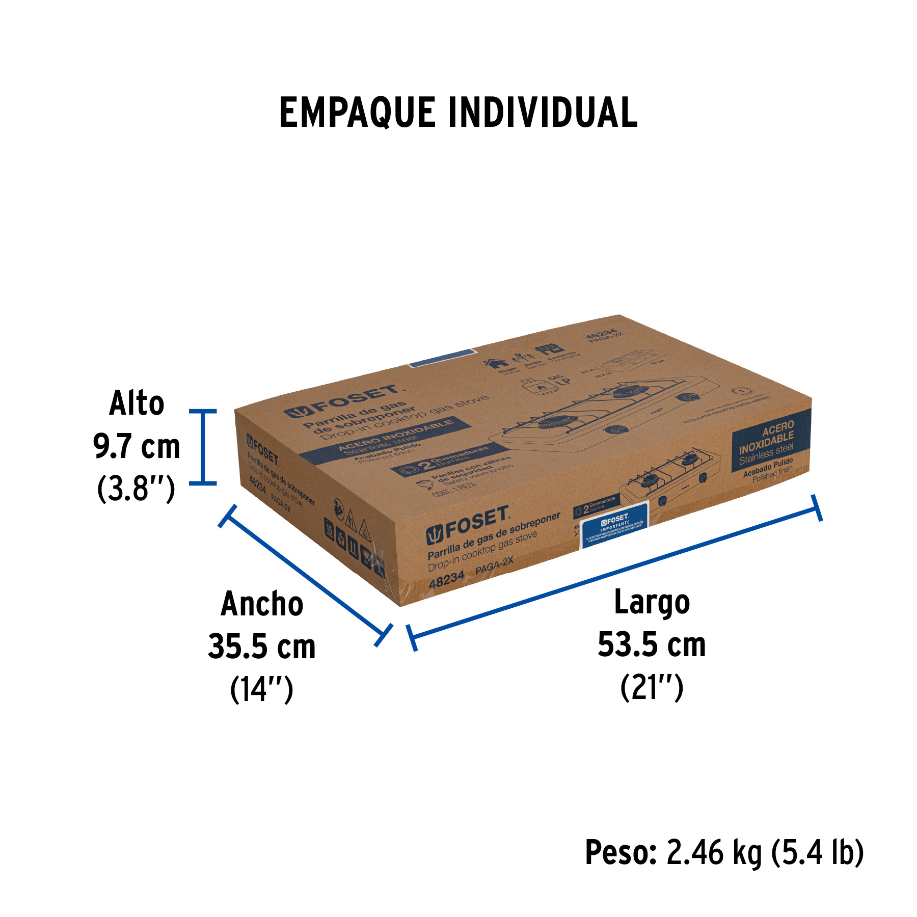 Parrilla de gas de sobreponer 2 quemadores, inox, FOSET