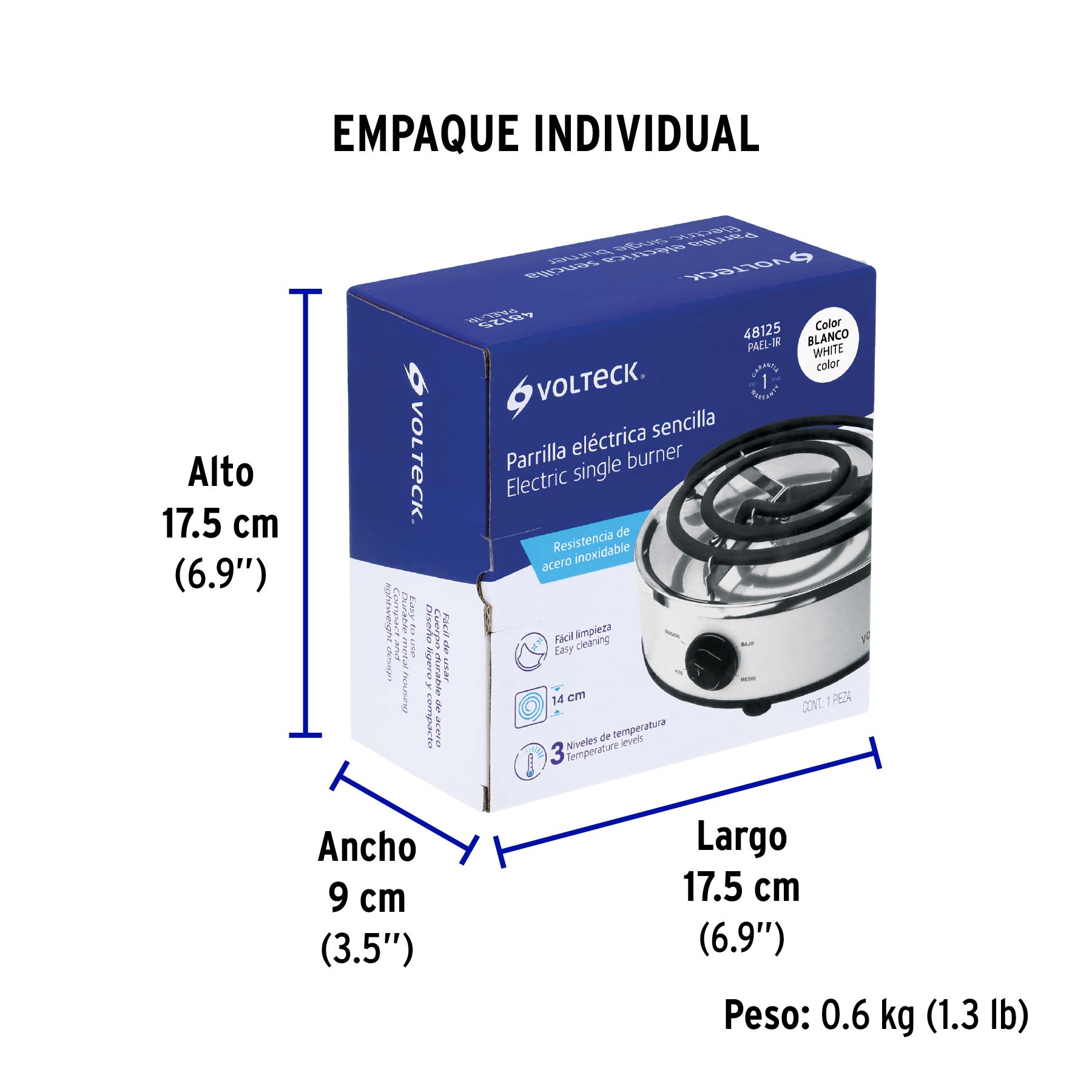 Parrilla eléctrica red. 1 quemador espiral, blanca, VOLTECK