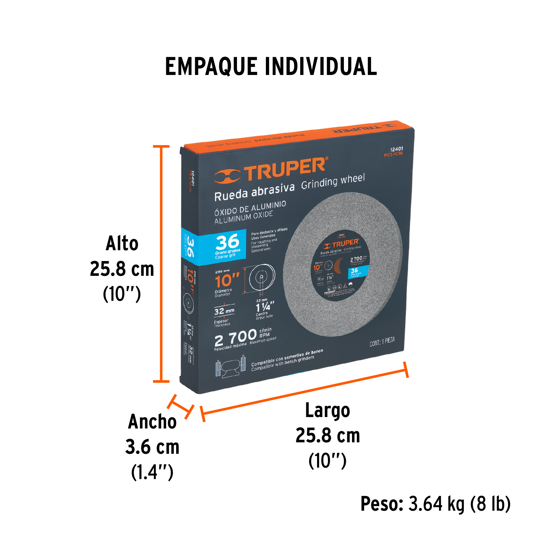 Rueda abrasiva p/esmeril 10"x32mm, óxido aluminio, grano 36