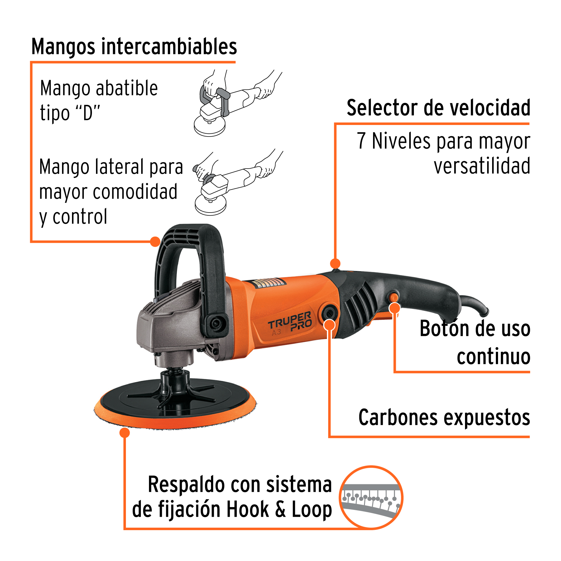 Mango abatible tipo "D", mayor control en pulido vertical y horizontal