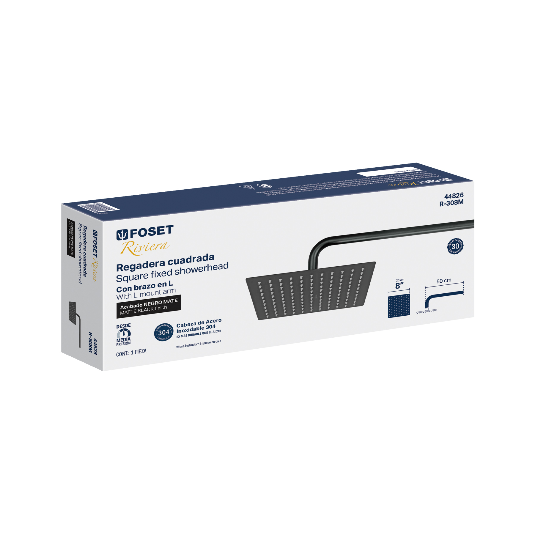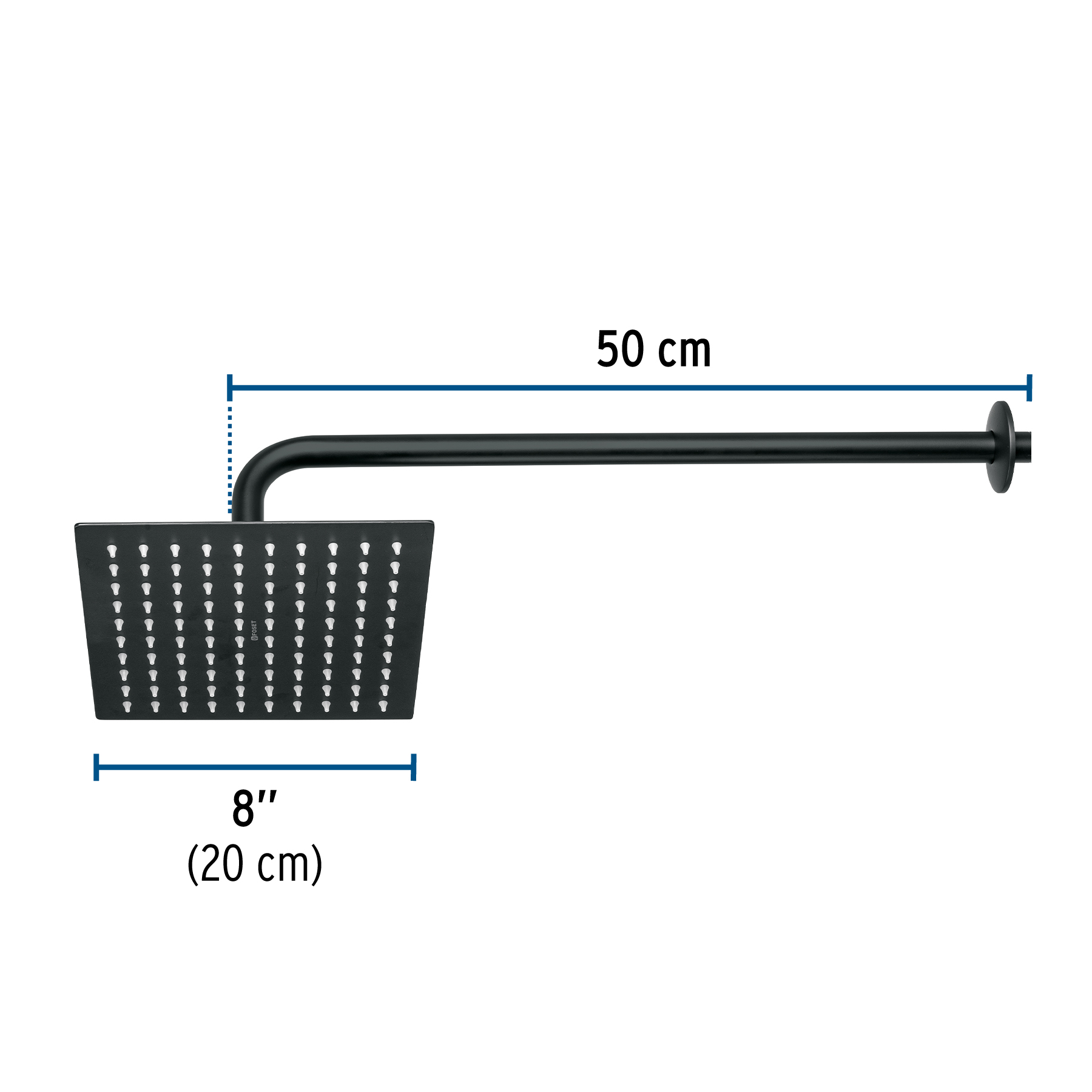 Regadera plato cuadrado 8" con brazo, negro, FOSET RIVIERA