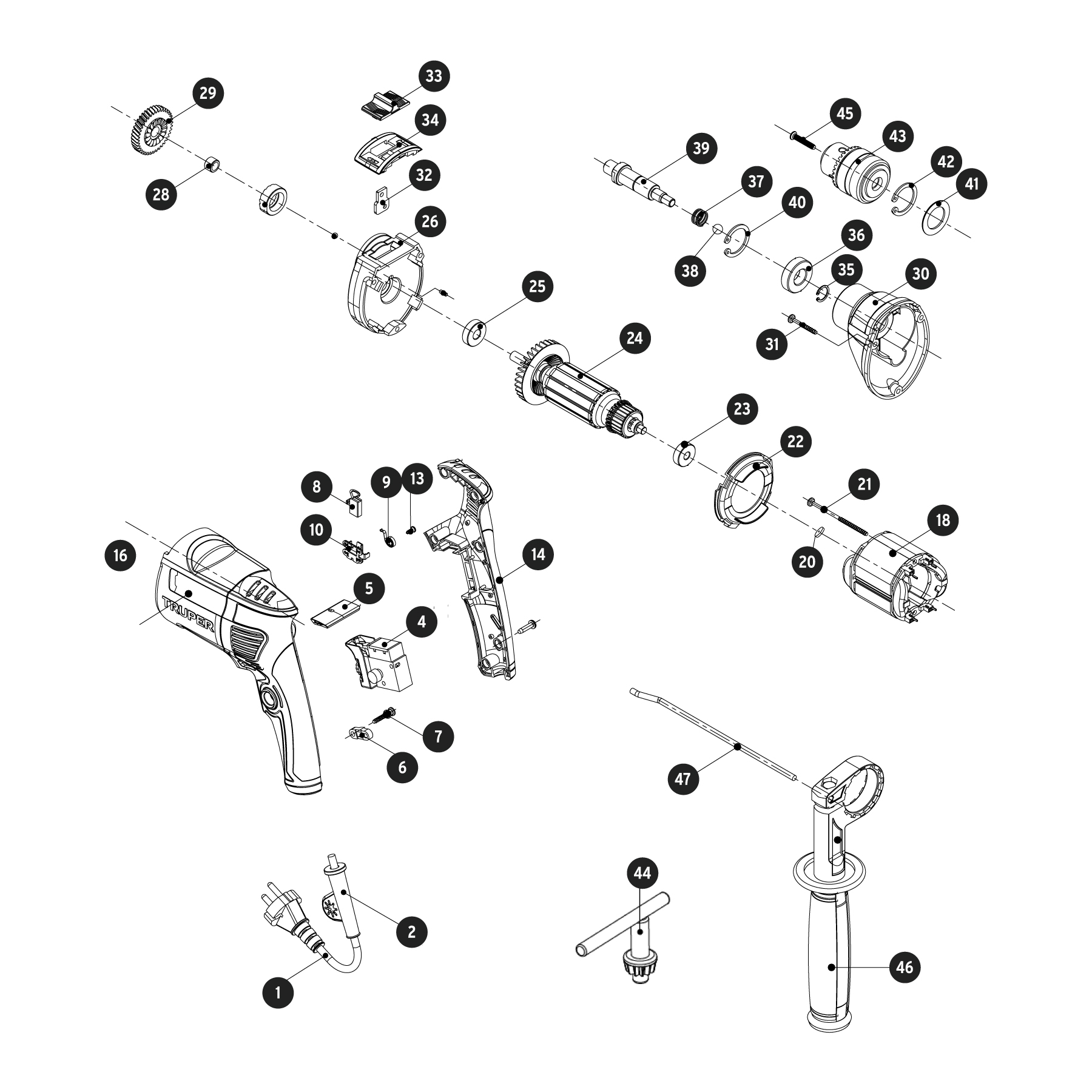 Selector de función taladro o rotomartillo, con velocidad variable reversible para uso como destornillador