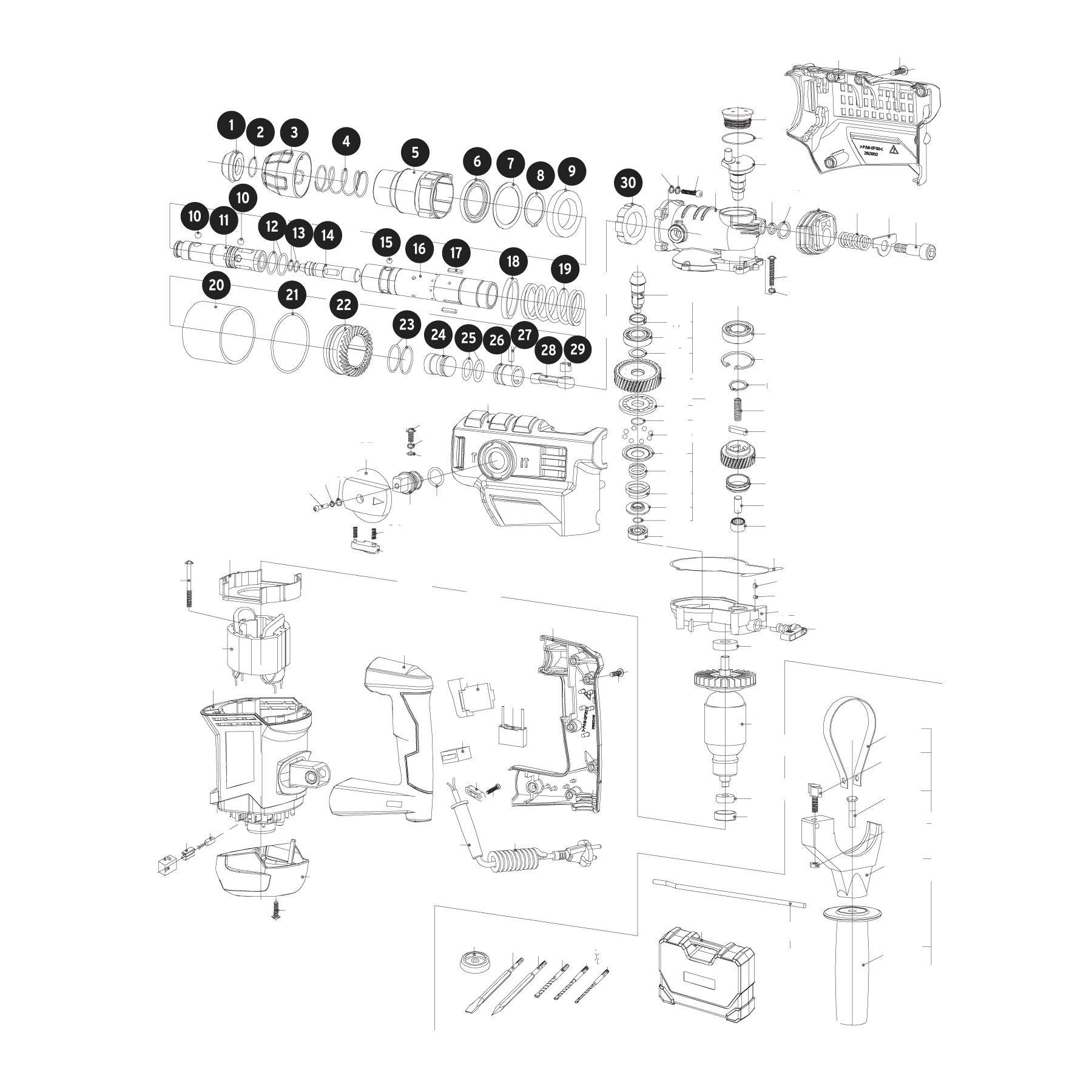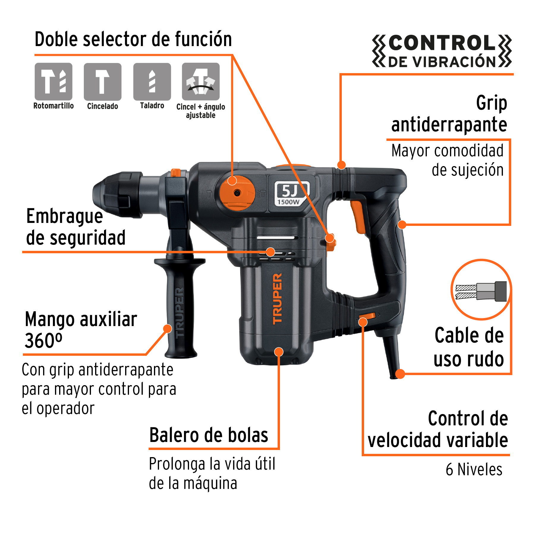4 Funciones: Taladro, Cincelado, Rotomartillo y Cincel + ángulo ajustable