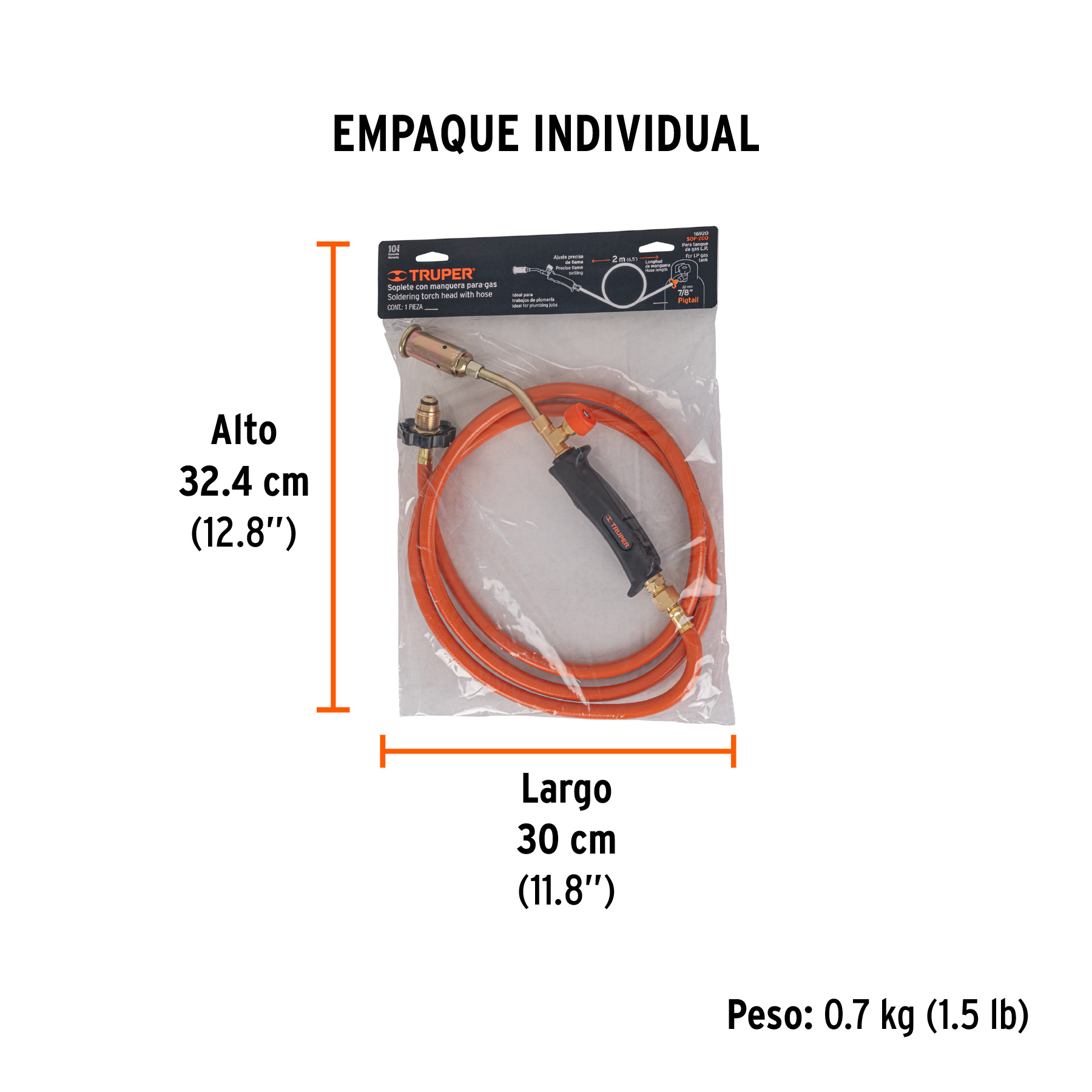 Soplete de latón con manguera de 2 m, punta pol 7/8", TRUPER