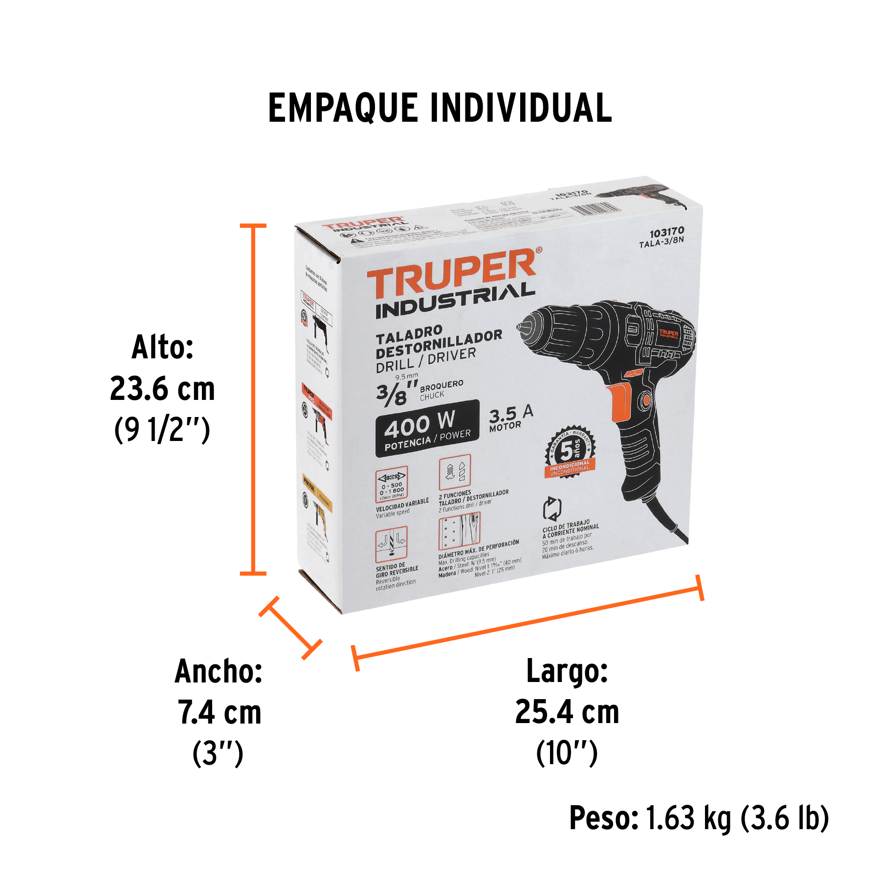 Taladro atornillador 3/8", 400W, TRUPER INDUSTRIAL