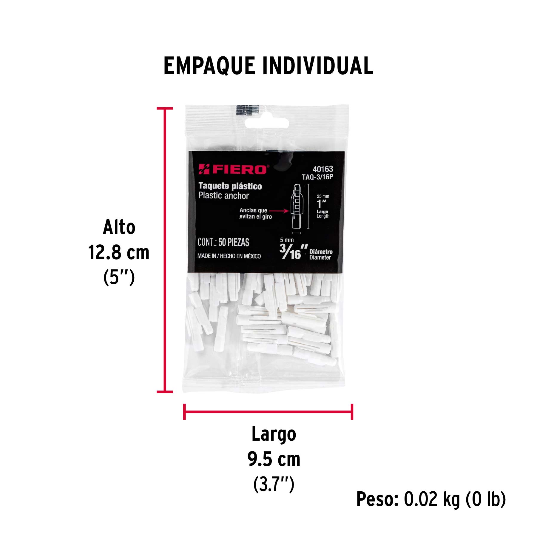 Bolsa con 50 taquetes de plástico 3/16", FIERO