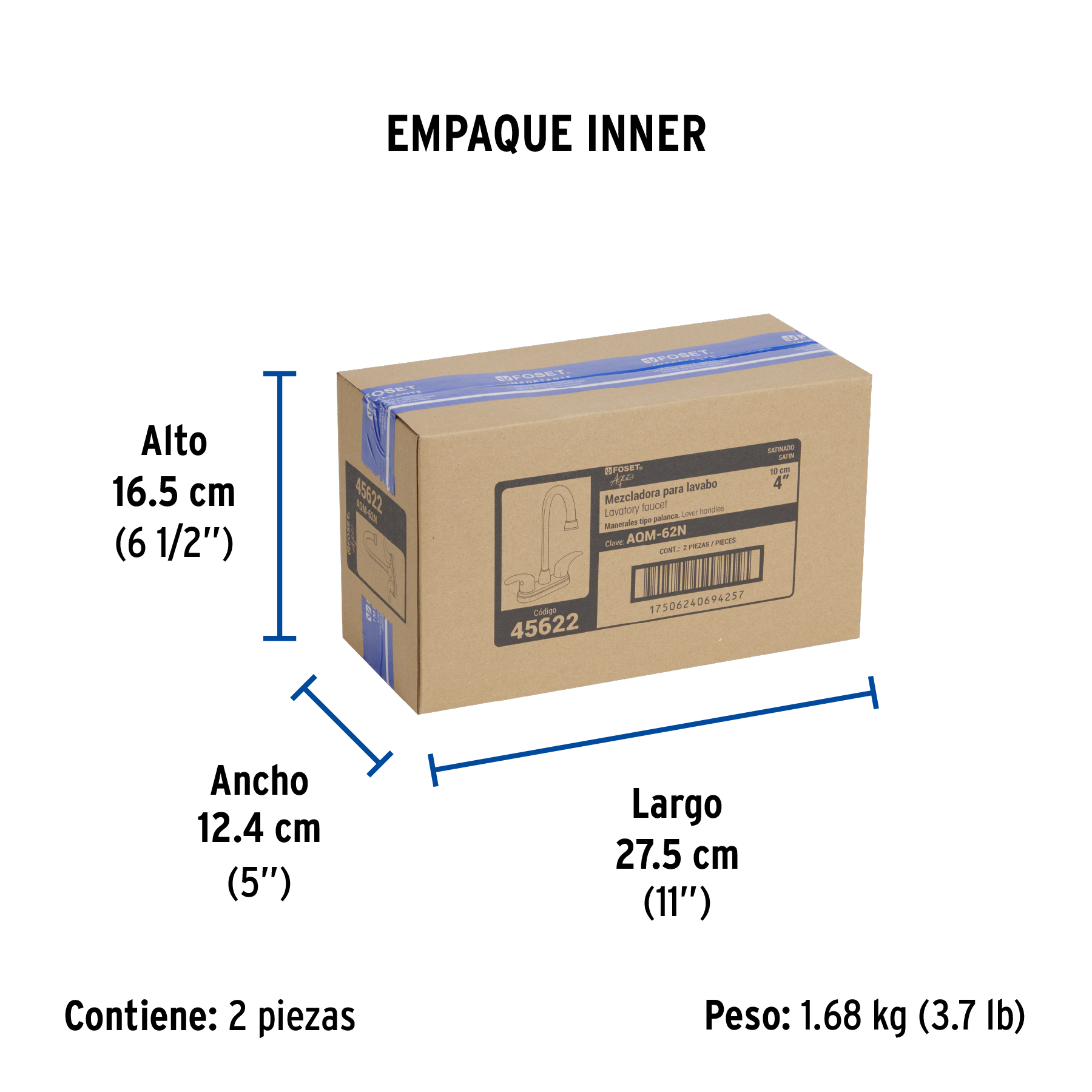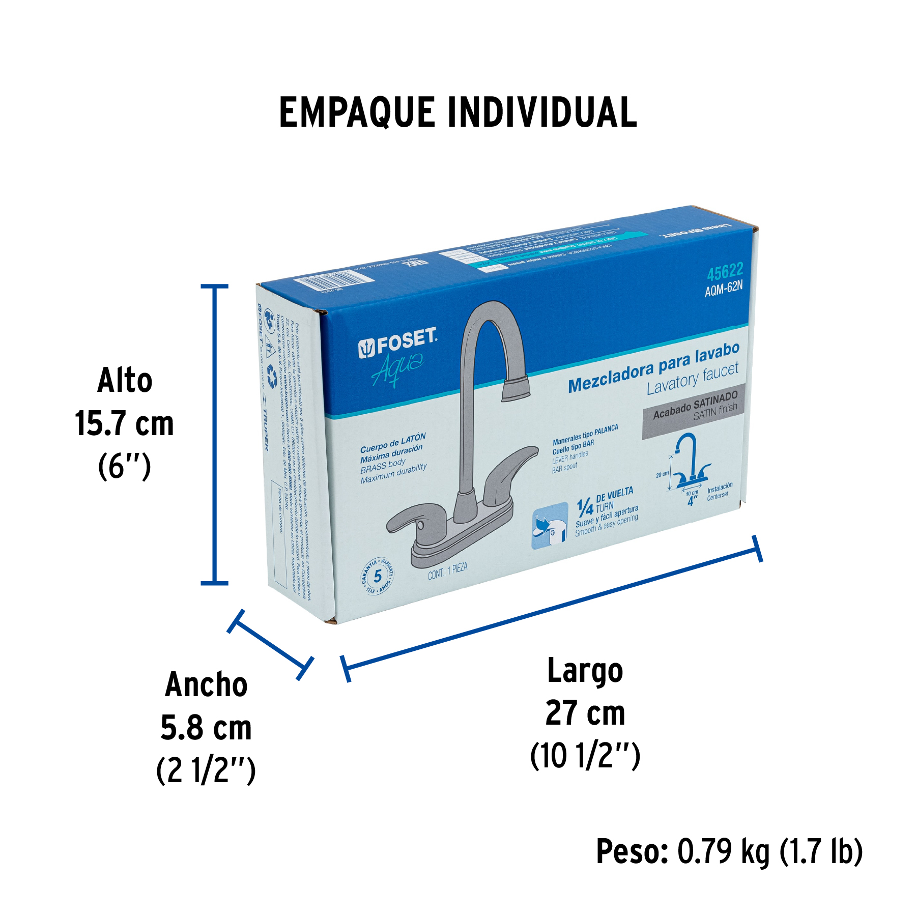 Mezcladora lavabo 4" satín, tipo bar, palanca, AQUA