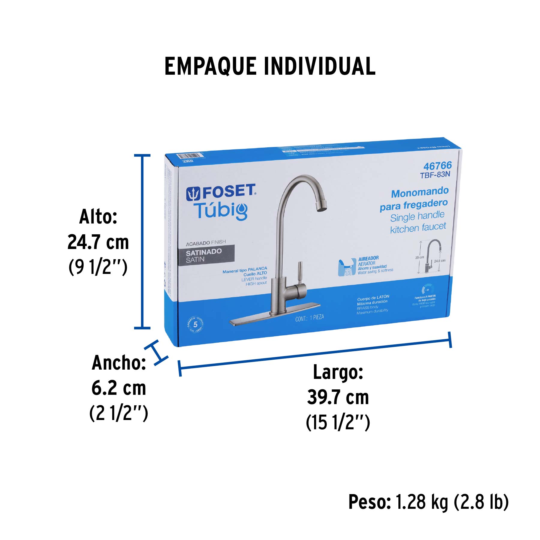 Monomando para fregadero, cuello alto, satín, FOSET TÚBIG